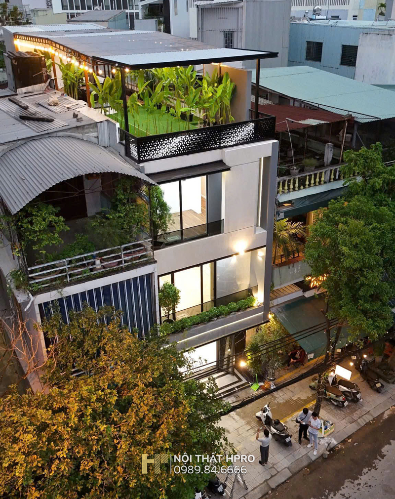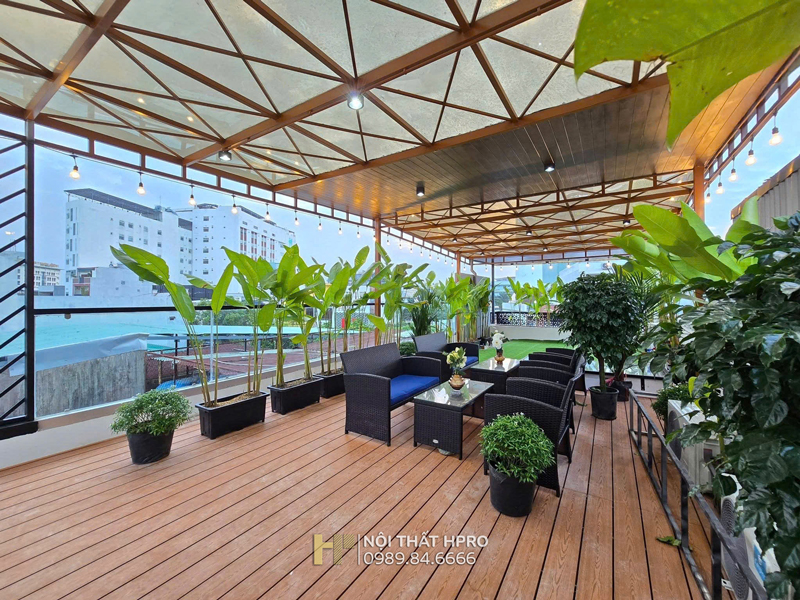 Tum trên tầng cao nhất được thiết kế thành sân thượng, decor cây cảnh và bàn trà, nơi nghỉ ngơi thư giãn chung của gia đình ngắm nhìn thành phố.