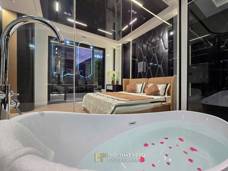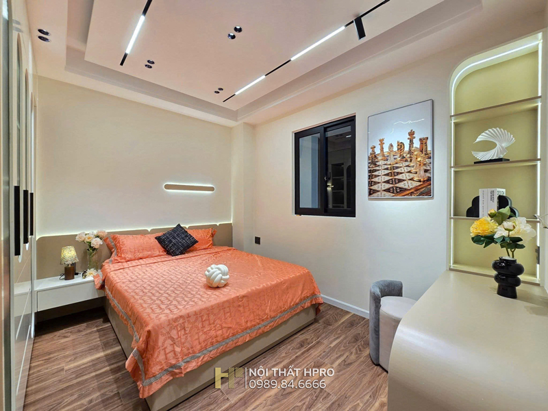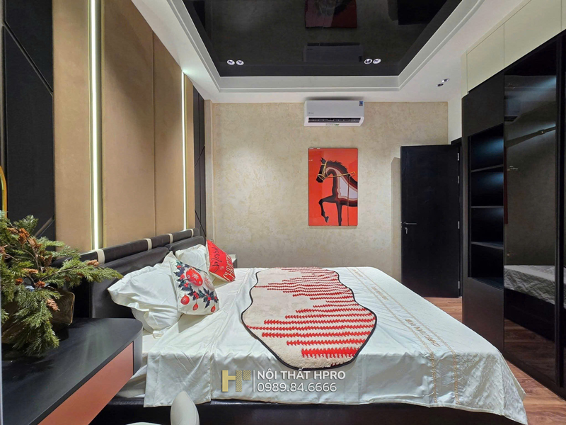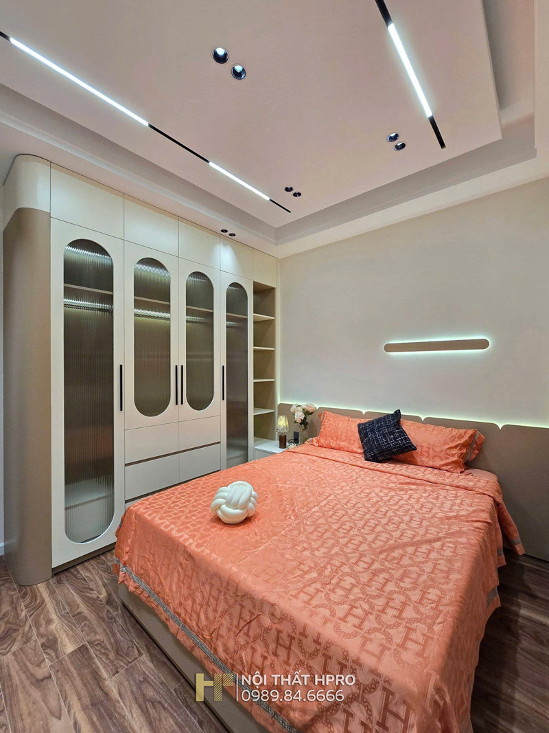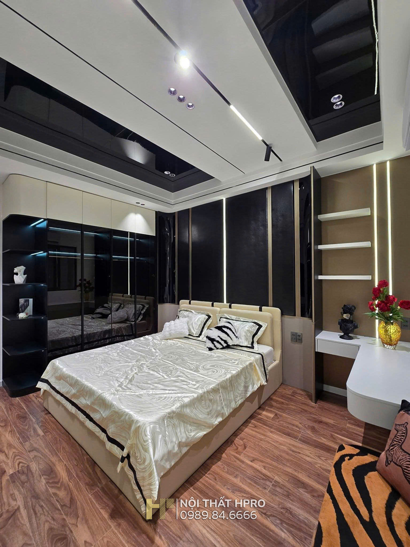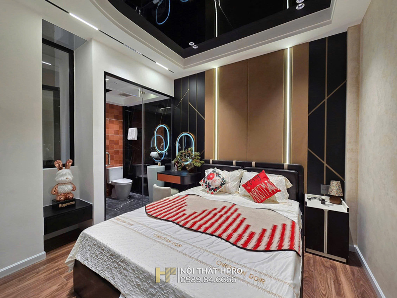 Mỗi phòng ngủ mang một sắc thái riêng, một tone màu khác nhau theo sở thích của các thành viên nhưng vẫn thống nhất phong cách hiện đại. Vách đầu giường bọc nệm, kết hợp gương trang trí và hệ đèn LED viền. Tủ quần áo cánh kính khung nhôm. Riêng phòng ngủ master có nhà vệ sinh cánh kính trong suốt thông với phòng ngủ, kết hợp bồn tắm lớn.