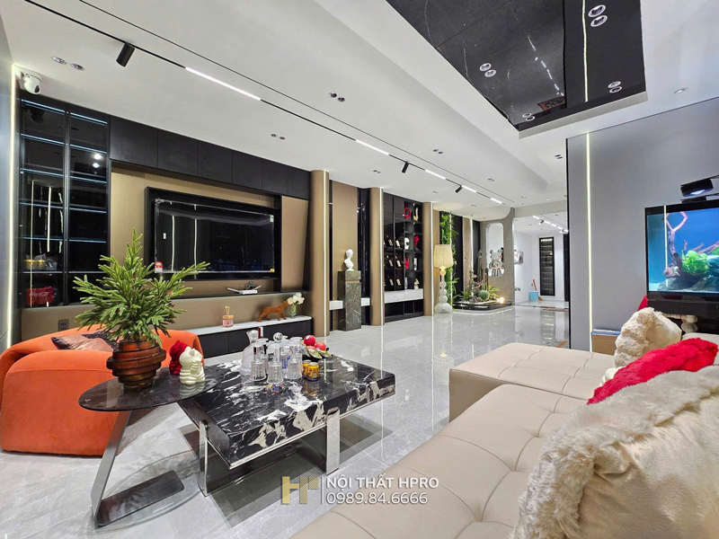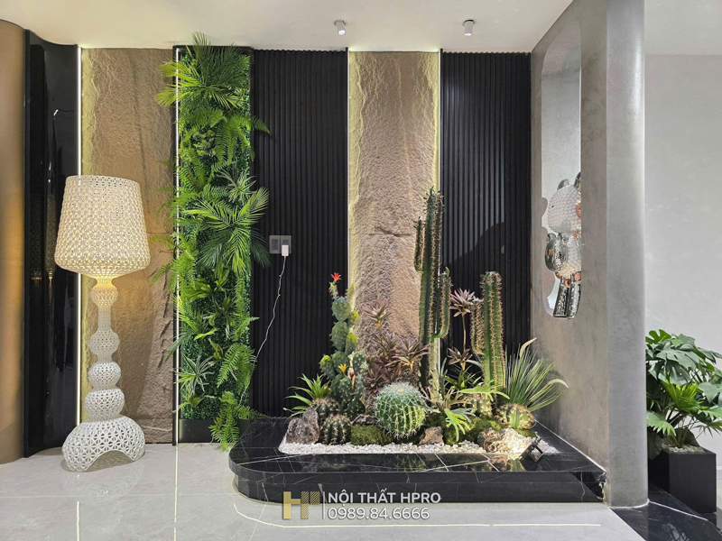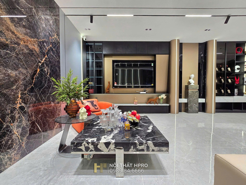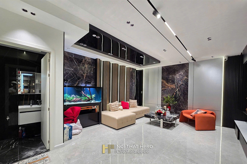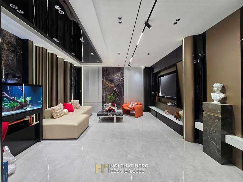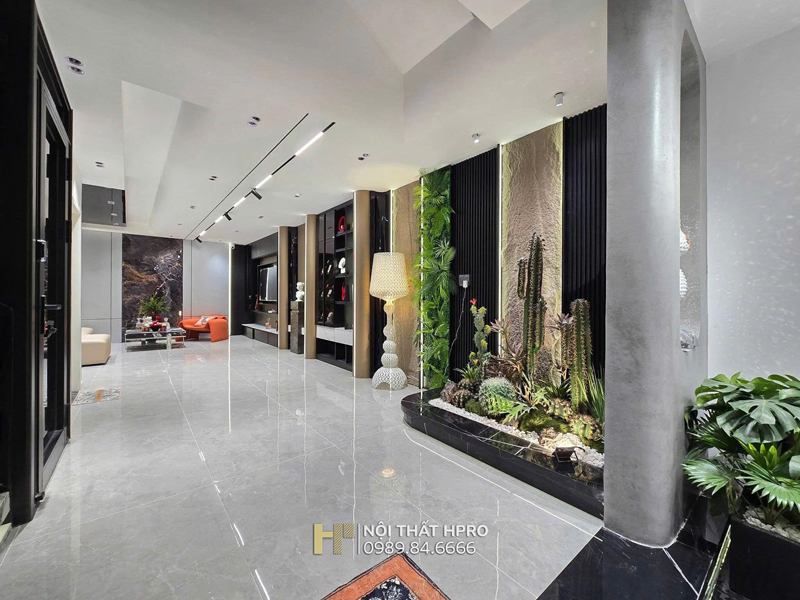 Không gian phòng khách rộng rãi khang trang với hệ tường ốp đá marble vân mây đen kết hợp lam sóng và chỉ kim loại ánh vàng. Trần giật cấp phối gương đen tạo chiều sâu thị giác, hệ đèn LED âm trần và đèn hắt khe mang lại hiệu ứng ánh sáng hiện đại. Sàn gạch porcelain khổ lớn màu xám bóng nội bật thêm cho trang trí tường. Ngay cửa ra vào được decor tiểu cảnh cây cối đẹp mắt.