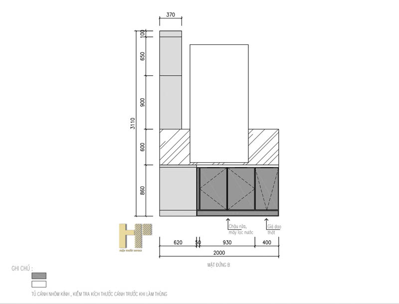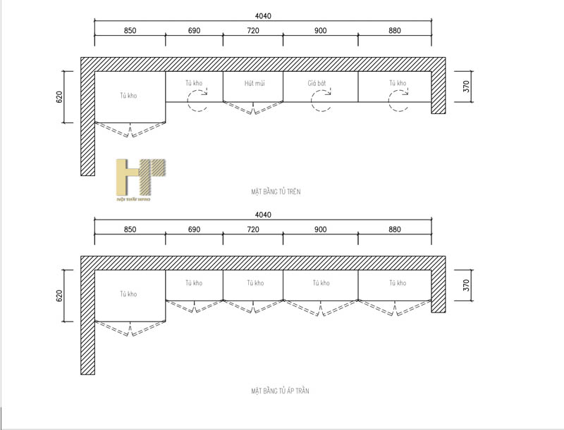 Dưới đây là bản vẽ thiết kế 2D và 3D được thực hiện bởi địa chỉ thi công tủ bếp cánh kính Nội Thất Hpro để bạn có thể hình dung rõ hơn về không gian bếp độc đáo này: