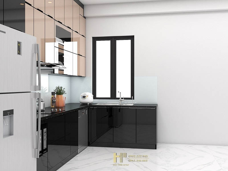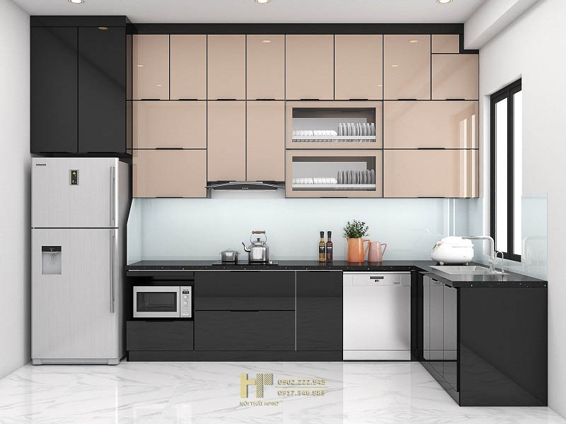 Bộ tủ bếp TBI03 được Hpro thiết kế khá đặc biệt: tủ dưới chữ L, gọn gàng ôm trọn góc bếp; tủ trên dáng chữ I, kéo dài kịch trần giúp tận dụng tối đa không gian cất trữ. Nhờ vậy, dù căn bếp không quá lớn vẫn trông thoáng hơn hẳn, ngăn nắp và rất hiện đại.