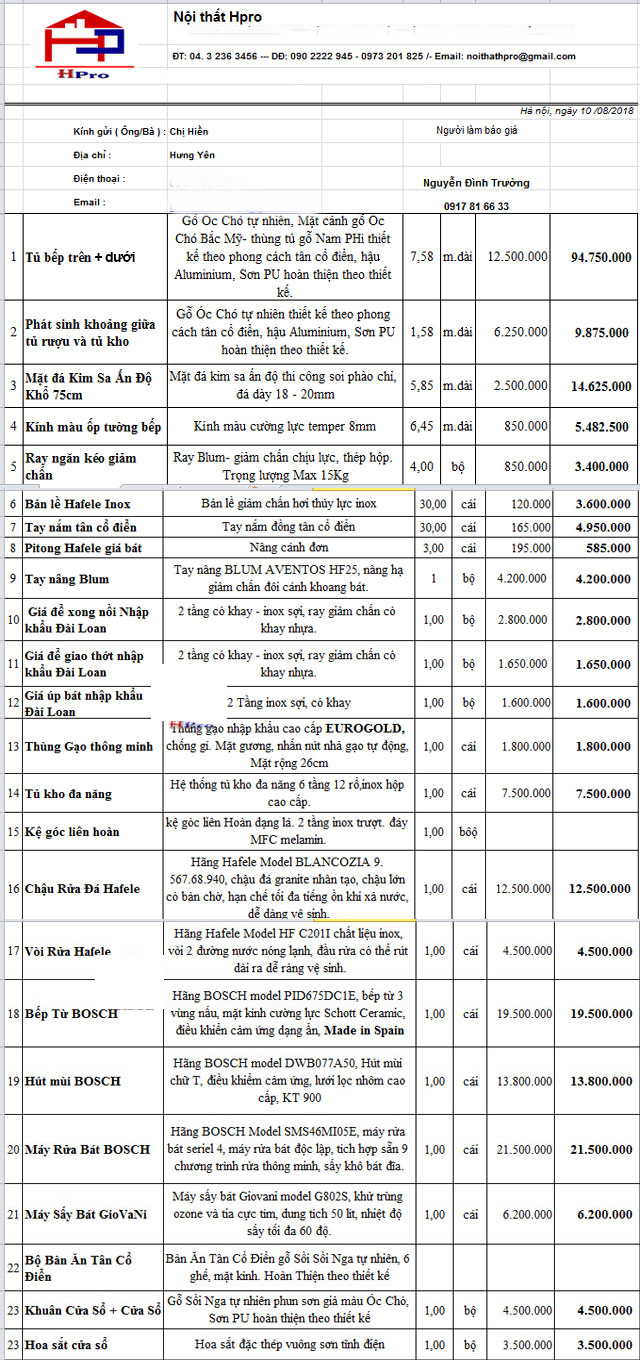 Bảng báo giá bán tủ bếp gỗ óc chó tại nhà chị Hiền tại Hưng Yên