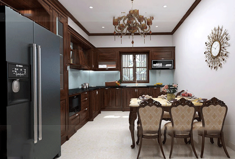 Bàn ăn được phối hợp ăn ý với tủ bếp, sử dụng chất liệu gỗ cùng tông màu, thiết kế ghế mềm mại với họa tiết sang trọng, làm tăng thêm nét tinh tế và ấm áp cho không gian chung. Đèn chùm pha lê cổ điển cùng đồng hồ trang trí tường góp phần hoàn thiện vẻ đẹp quý phái, nâng tầm tổng thể phòng bếp trở nên vừa sang trọng vừa gần gũi.