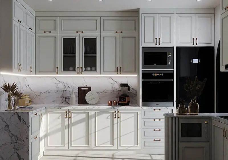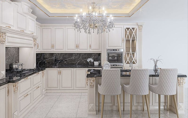 Các đường phào chỉ, gờ nổi và hoa văn chạm khắc là linh hồn của phong cách tân cổ điển. Khi khách hàng yêu cầu họa tiết phức tạp, kích thước phào lớn hoặc độ chạm sâu nhiều lớp, xưởng sản xuất sẽ phải thực hiện nhiều công đoạn hơn và mất nhiều thời gian hơn. Chính vì vậy, báo giá tủ bếp gỗ tân cổ điển cũng tăng theo mức độ cầu kỳ của chi tiết trang trí.
