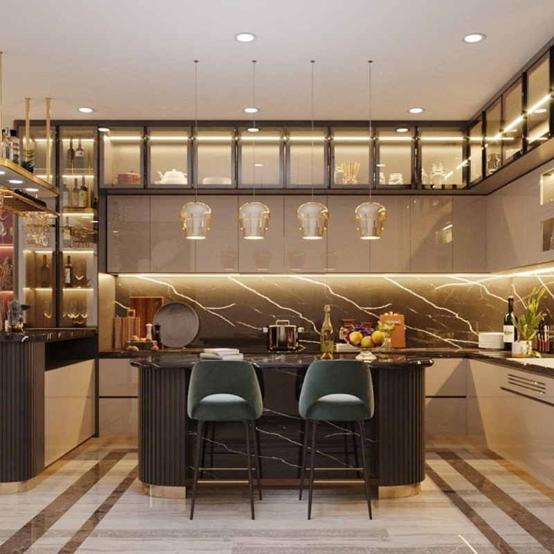 Tủ bếp Inox cánh kính cho không gian tân cổ điển thêm phần sang trọng