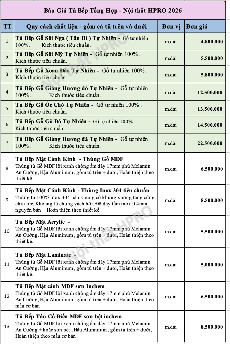 Mời quý khách tham khảo bảng báo giá chi tiết các chất liệu tủ bếp tại HPRO cập nhật mới nhất năm 2026: