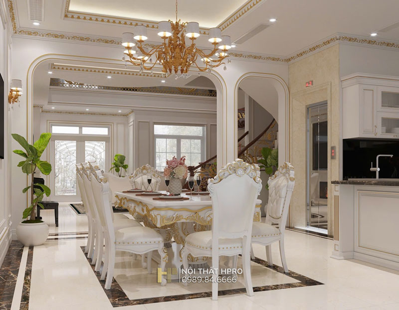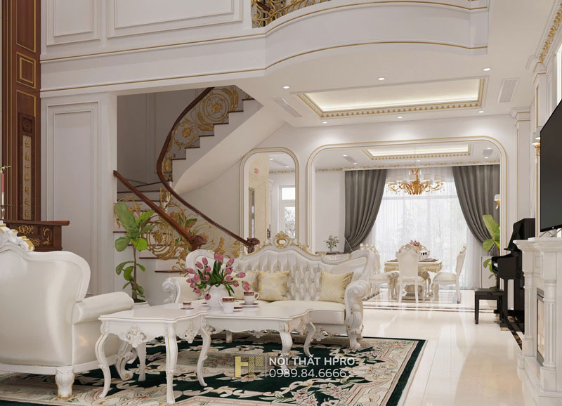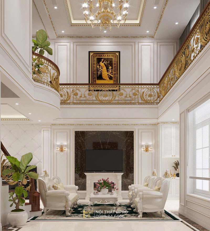 Toàn bộ không gian được sơn màu trắng sứ tinh khôi, kết hợp các đường phào chỉ vàng gold sắc nét, tạo nên hiệu ứng thị giác xa hoa nhưng không phô trương. Từ sofa, kệ trang trí đến bộ đèn chùm đều được lựa chọn theo tone vàng – trắng đồng bộ, làm nổi bật vẻ lộng lẫy đặc trưng của phong cách tân cổ điển.