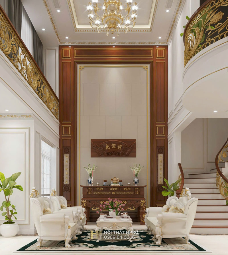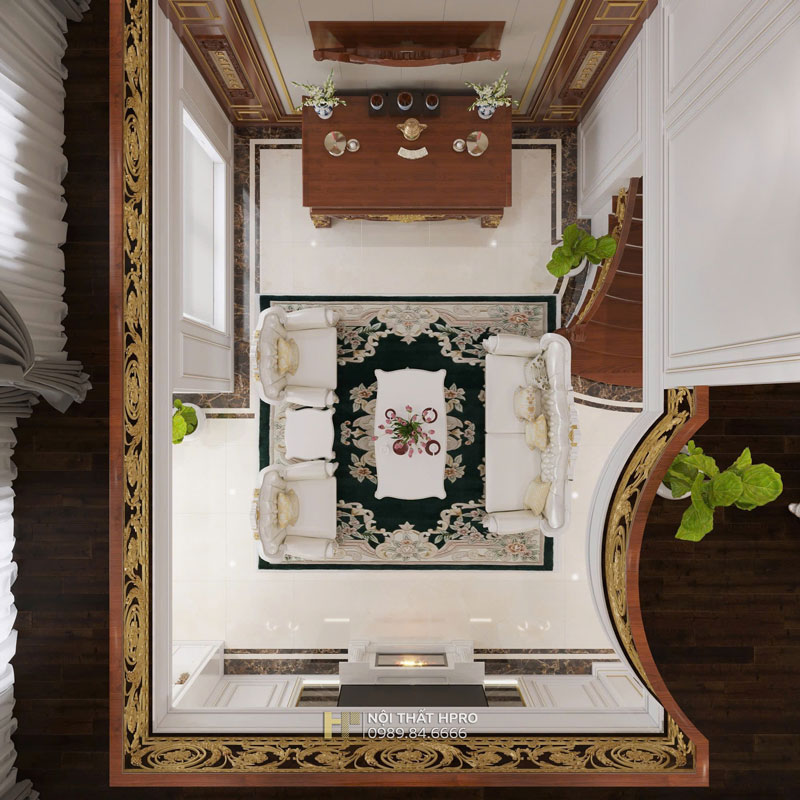 Tổng thể phòng khách biệt thự mang vẻ đẹp của sự kết hợp hoàn hảo: thanh lịch, trang trọng, hiện đại nhưng vẫn giữ được tinh thần cổ điển tinh tế.