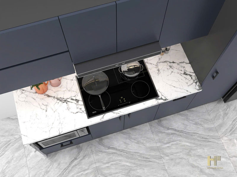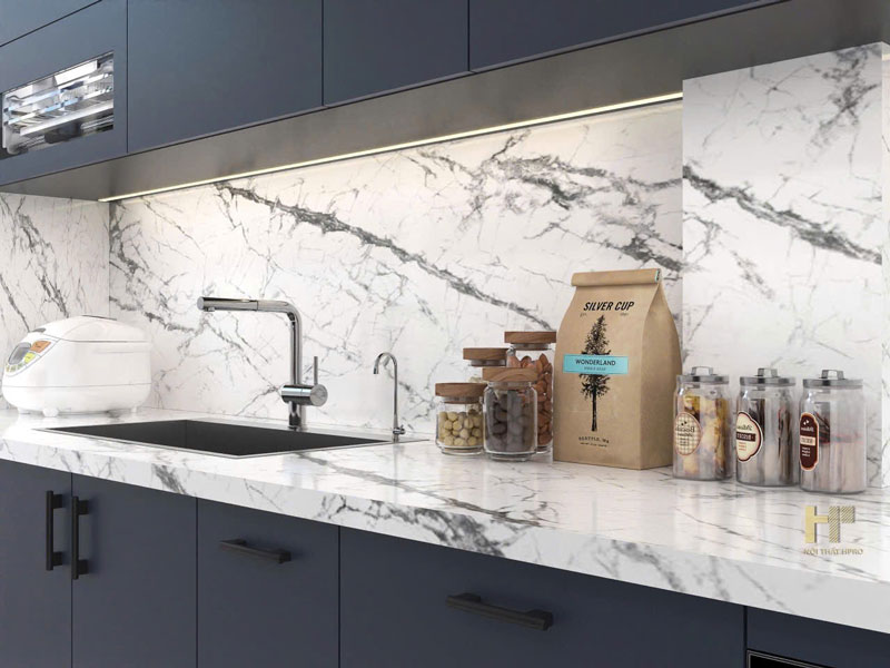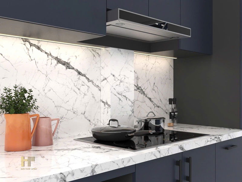 Mặt bàn bếp và ốp tường sử dụng đá nung kết vân mây trắng nổi bật, tạo sự tương phản nhẹ nhàng với màu cánh tủ, làm tăng hiệu ứng mở rộng không gian.