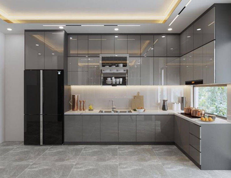 Cánh kính bóng có thể tạo được hiệu ứng sáng và “nổi khối”, giúp căn bếp trông có chiều sâu và nhìn sang hơn, đặc biệt khi đi kết hợp cùng với hệ đèn hắt và mặt đá sáng.
