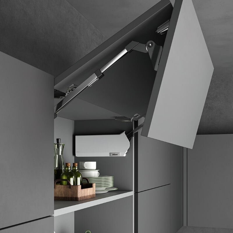 Lấy đồ không bị cản trở:Tay nâng Blum Aventos HF Top giúp người sử dụng có thể hoàn toàn tự do di chuyển, mặt trước không gây cản trở cho họ. Tủ treo tường có thể để mở mà không cản trở việc nấu bếp.
