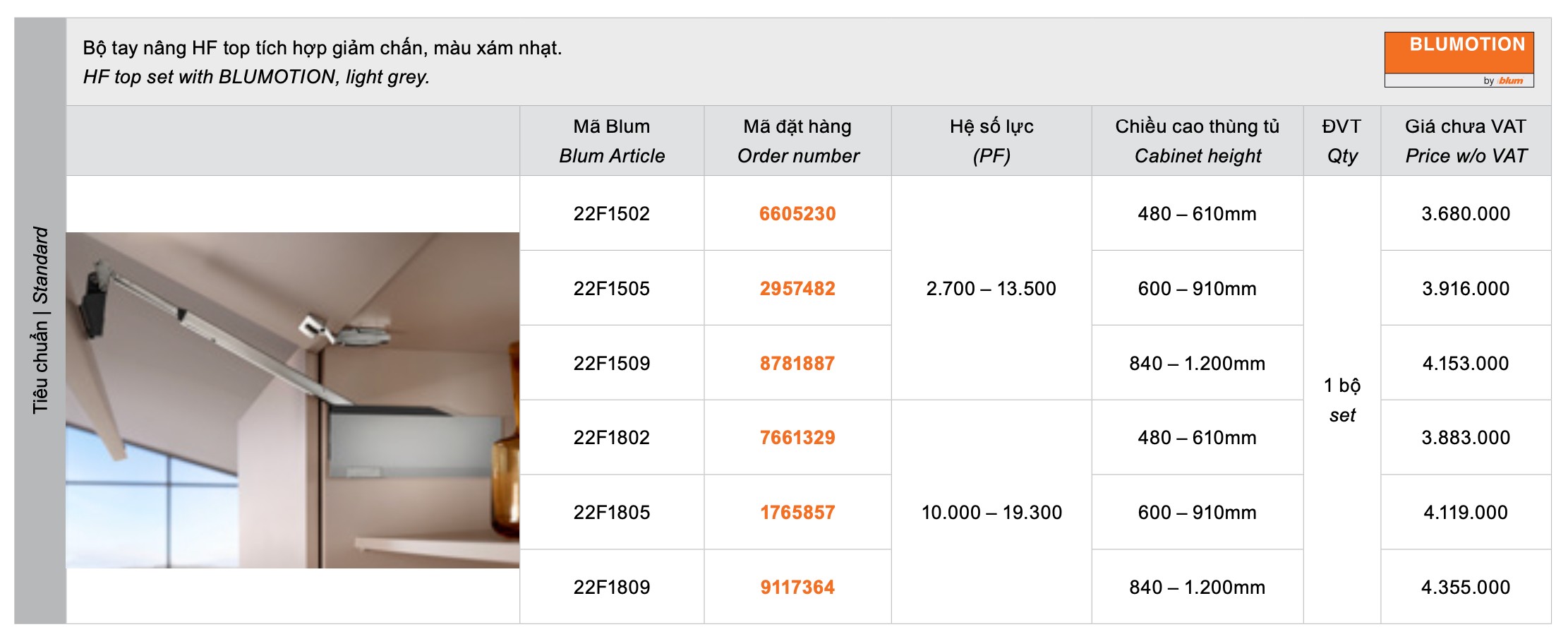 Tay nâng Blum AVENTOS HF cao cấp, dành cho nâng hệ 2 cánh mở đấy lên, có hỗ trợ nâng lực cánh và dừng ở mọi vị trí . TAY NÂNG ĐÔI BLUM AVENTOS HF TOP CHIỀU CAO 480-1200MM Tên: Tay nâng Blum Aventos HF Top Xuất Xứ: Áo
