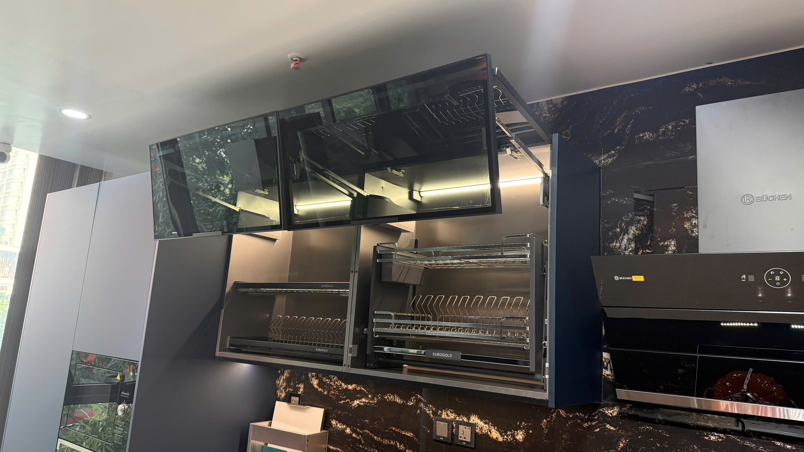 Thiết kế hài hòa: Mặt trước lớn và rộng với khoảng hở nhỏ, tạo ra thiết kế mềm mại và liền mạch. AVENTOS giúp bạn đồng bộ thiết kế từ tủ treo tường đến tủ bếp dưới.