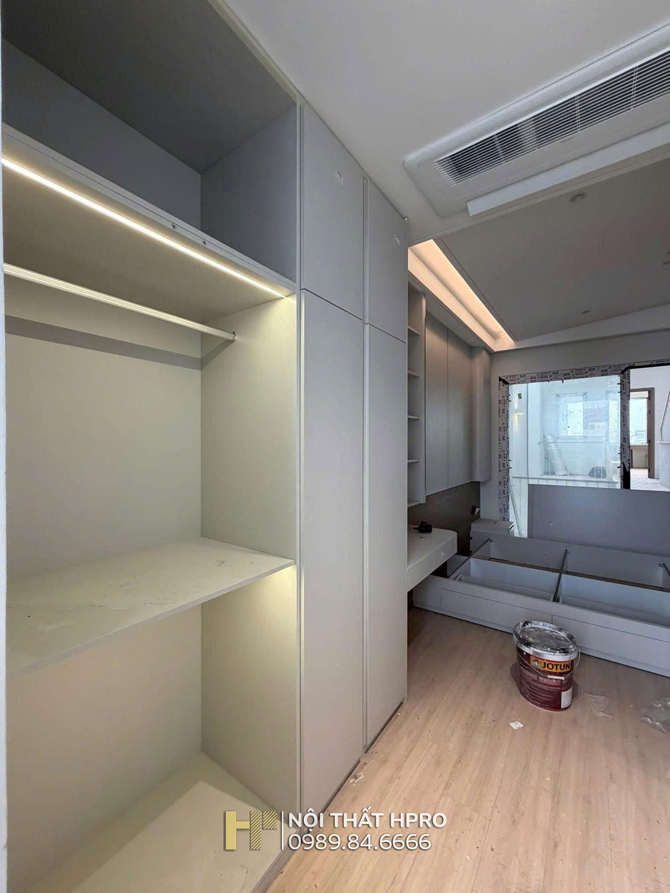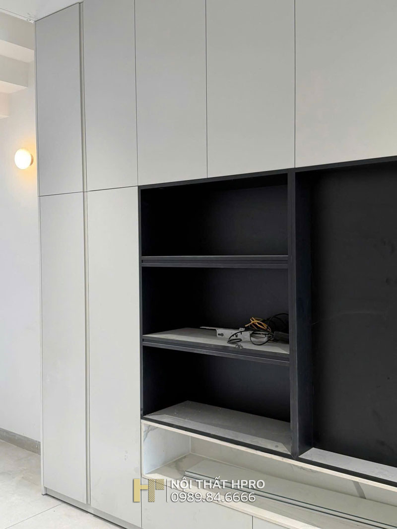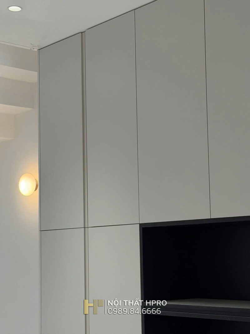 Tổng thể nội thất căn hộ sử dụng chất liệu gỗ MDF lõi xanh chống ẩm, bề mặt phủ Laminate kết hợp Melamine An Cường, vừa đảm bảo độ bền, hạn chế mối mọt, khả năng chống ẩm tốt, vừa mang lại vẻ đẹp hiện đại.
