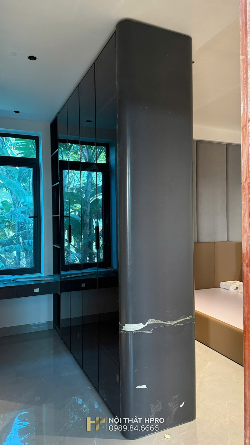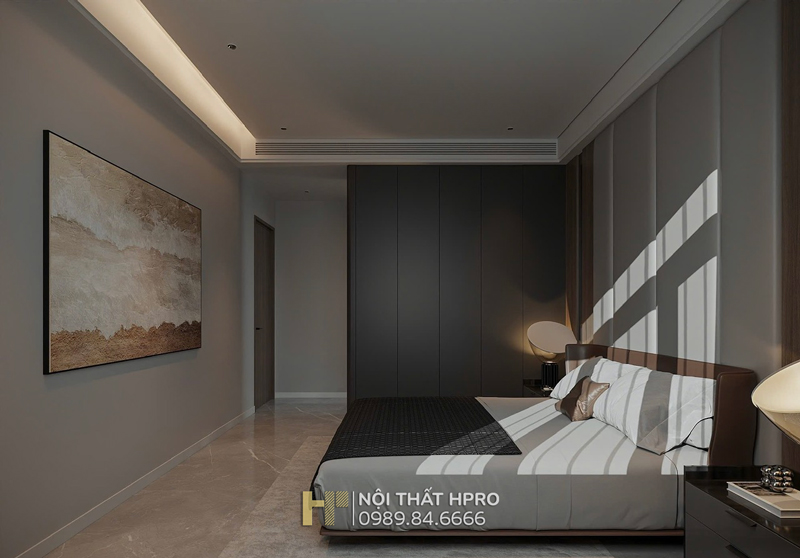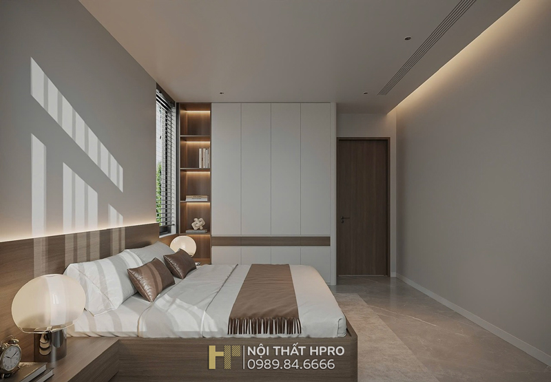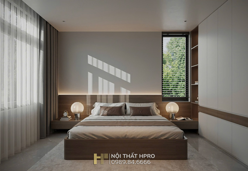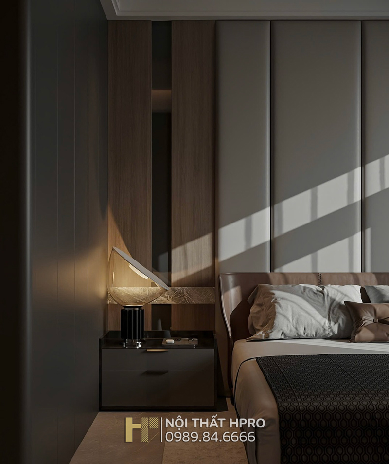 Phòng ngủ master là điểm nhấn với tủ áo độc lập cánh kính, hộc tủ gỗ Laminate, vừa đóng vai trò lưu trữ vừa khéo léo trở thành vách ngăn giữa giường ngủ và khu vệ sinh, thiết kế đầu hồi bo cong mềm mại, tinh tế.