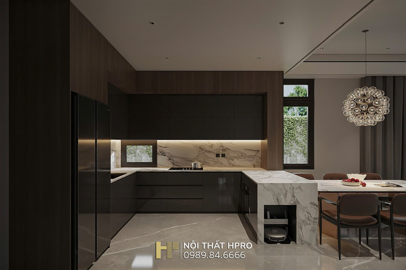 Khu bếp thiết kế chữ U cùng bàn đảo bếp tối ưu công năng, mặt cánh Acrylic kết hợp thùng Melamine và thùng tủ bếp dưới inox 304 gập chấn module rời, đảm bảo độ bền, dễ vệ sinh và thuận tiện khi sử dụng.
