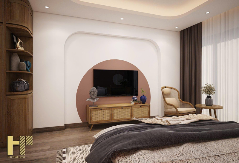 Sử dụng tone màu chủ đạo be – trắng kem kết hợp nâu gỗ tự nhiên mang lại cho căn phòng ấm cúng, thoáng đãng nhưng vẫn giữ được chiều sâu cảm xúc. Các mảng tường được bo cong mềm mại, điểm nhấn vòm trang trí sau tivi và các đồ gỗ nội thất đã tạo nên nét đặc trưng rất “Scandinavian”.