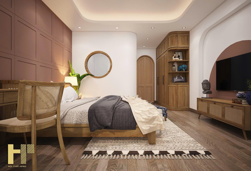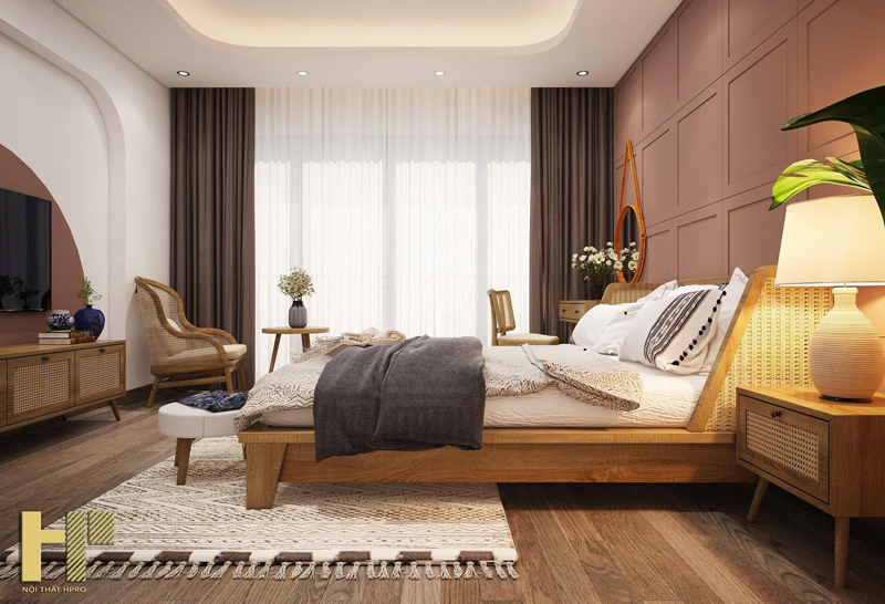 Chất liệu gỗ tự nhiên được sử dụng xuyên suốt từ giường, tủ, kệ đến bàn trang điểm, kết hợp ghế mây đan, vải dệt thô và thảm họa tiết Bắc Âu. Ánh sáng vàng ấm cùng đồ decor tối giản giúp không gian trở nên gần gũi, nhẹ nhàng.