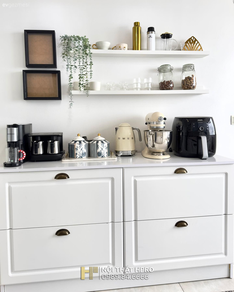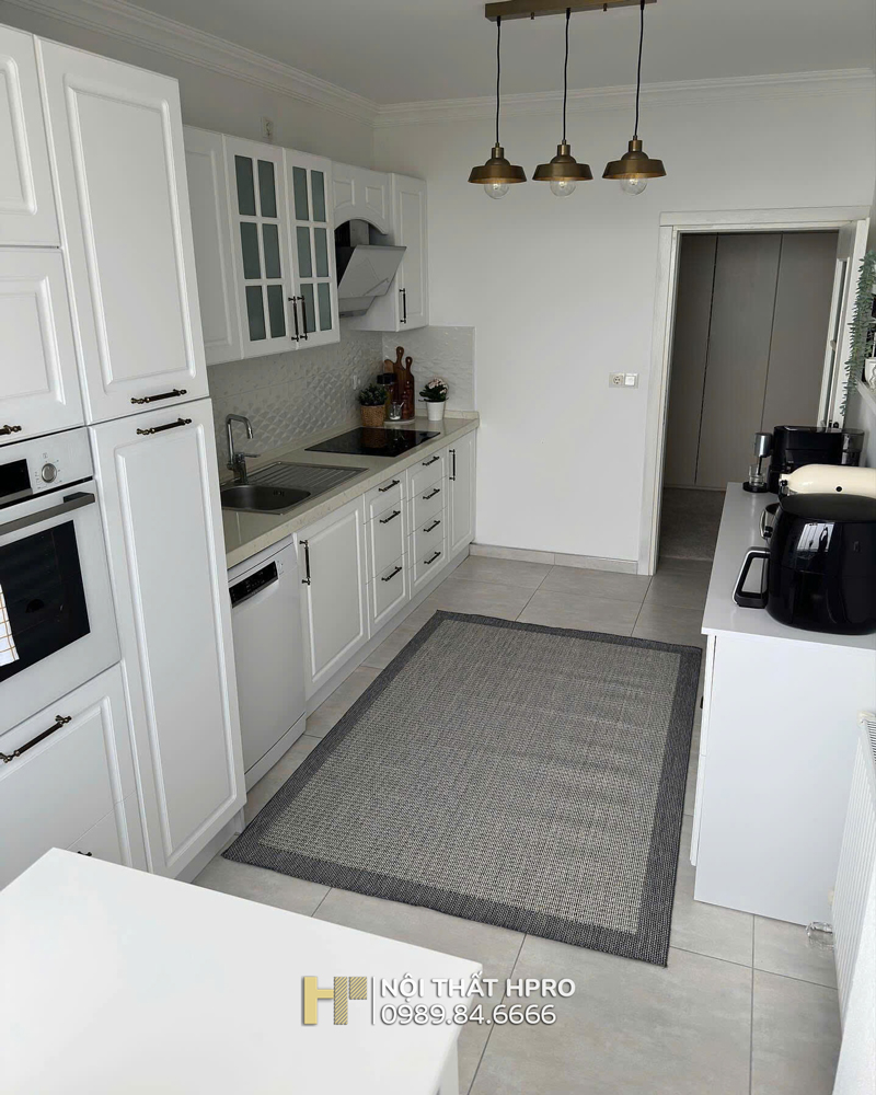 Hệ tủ chính được thiết kế đầy đủ các thiết bị của tủ bếp như chậu rửa, bếp nấu, máy rửa bát và lò nướng âm tủ... Hệ tủ đối diện giống như một chiếc bàn đảo nhỏ, để đồ khô và đặt các thiết bị nhỏ (máy pha cà phê, máy đánh trứng, nồi chiên không dầu). Tủ bếp được làm từ gỗ MDF chống ẩm, sơn bệt 2K trắng cao cấp. Mặt bàn đá marble trắng vân mây nhẹ nhàng. Ốp gạch trang trí với họa tiết 3D hình học cùng tông trắng để giữ sự thanh lịch vốn có của phong cách Bắc Âu nhưng vẫn vừa đủ để tạo điểm nhấn cho gian bếp toàn màu trắng.