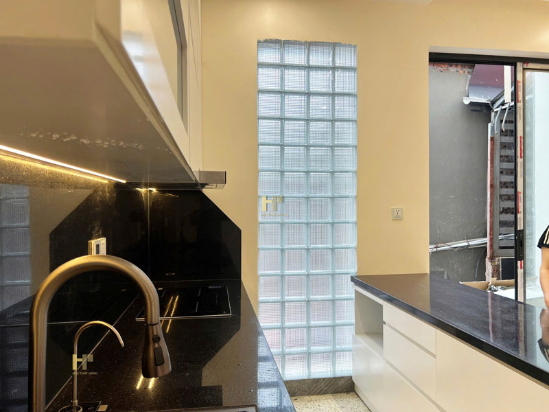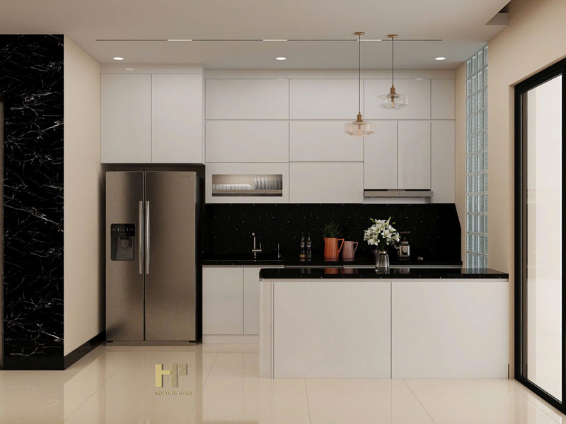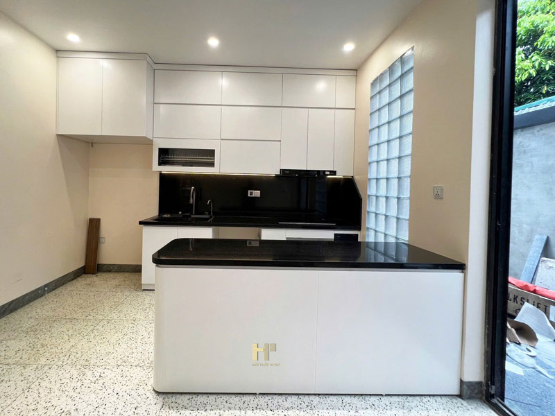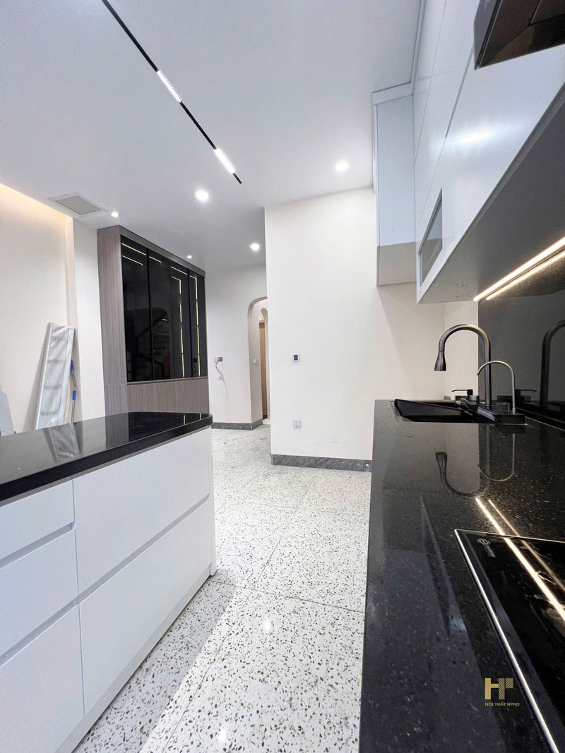 - Khu bếp được thi công đồng bộ theo bản vẽ với tủ bếp Acrylic trắng bóng, đầy đủ công năng cho sinh hoạt hàng ngày. Bàn đảo kết hợp đá đen tạo sự tương phản cuốn hút, vừa đẹp mắt vừa tiện lợi khi sử dụng.