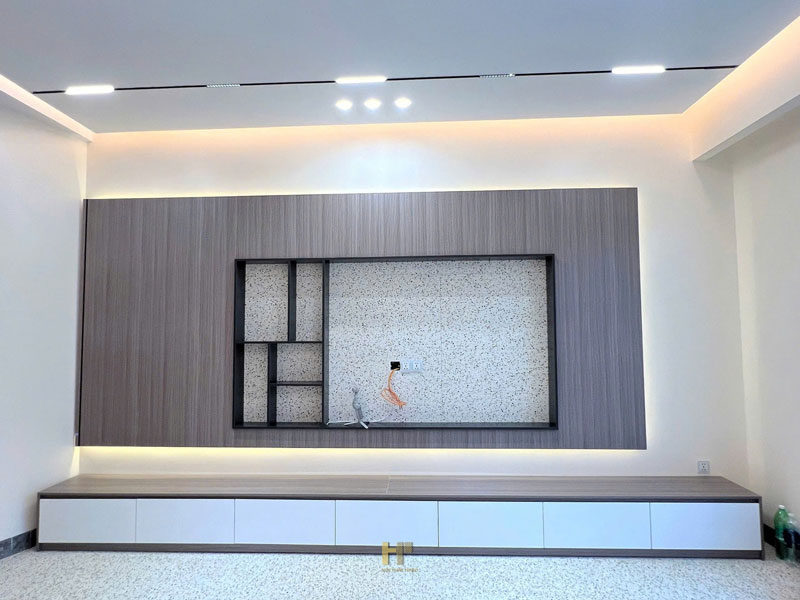 - Phòng khách gây ấn tượng mạnh bằng kệ tivi gỗ công nghiệp kết hợp đá, thiết kế tối giản nhưng vẫn nổi bật nhờ mảng ốp tinh tế và hệ đèn led hắt sang trọng.