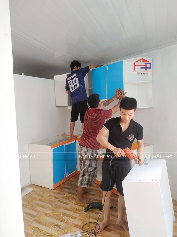 Đội thợ Hpro đang thi công lắp đặt tủ bếp acrylic TBAC143 đẹp nhà chị Thủy – Tây Tựu