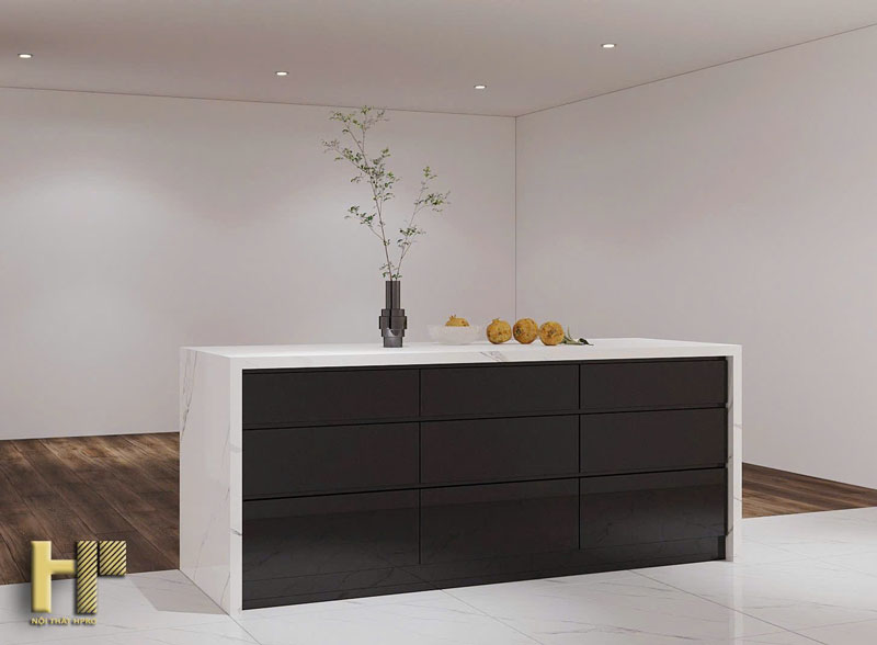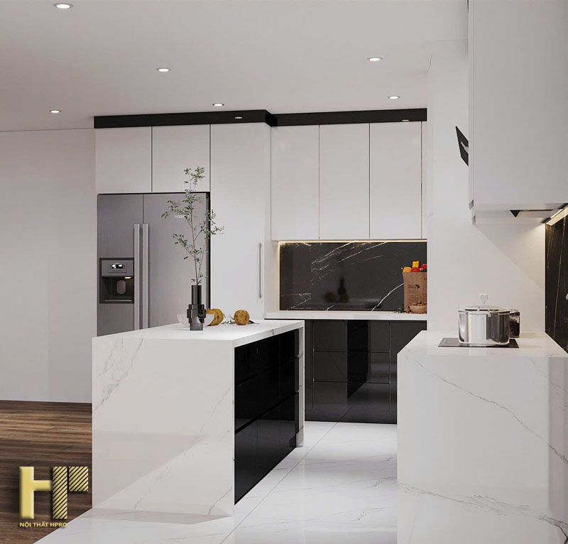 Mẫu tủ bếp Acrylic có bàn đảo mang đến diện mạo hiện đại, sang trọng và chuẩn công năng cho không gian bếp căn hộ cao cấp. Tổng thể sử dụng tone trắng – đen tương phản, tạo cảm giác gọn gàng, tinh tế và không lỗi thời.