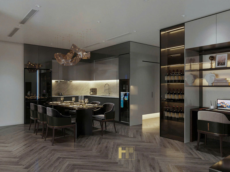 Không gian bếp của anh Vinh được Hpro thiết kế với tiêu chí hiện đại, tinh tế và sử dụng các vật liệu bền bỉ. Mặt cánh Acrylic bóng gương, mang đến vẻ sang trọng, phản chiếu ánh sáng giúp không gian bếp thêm rộng mở và sáng sủa. Thùng tủ inox 304 gấp chấn không mối hàn, cấu trúc module tách rời – đảm bảo siêu bền, chống nước tuyệt đối 100%, kháng mối mọt hoàn hảo.
