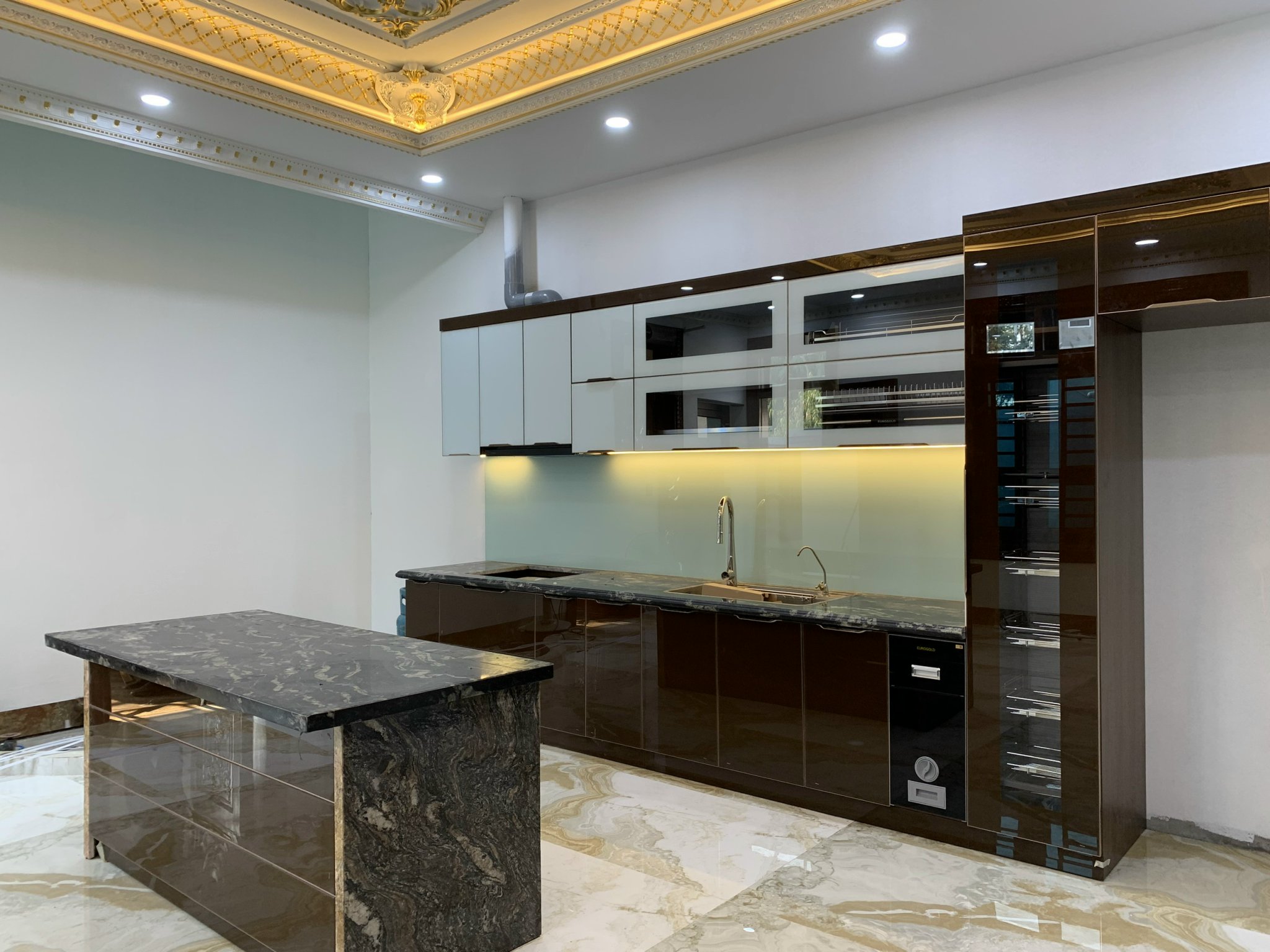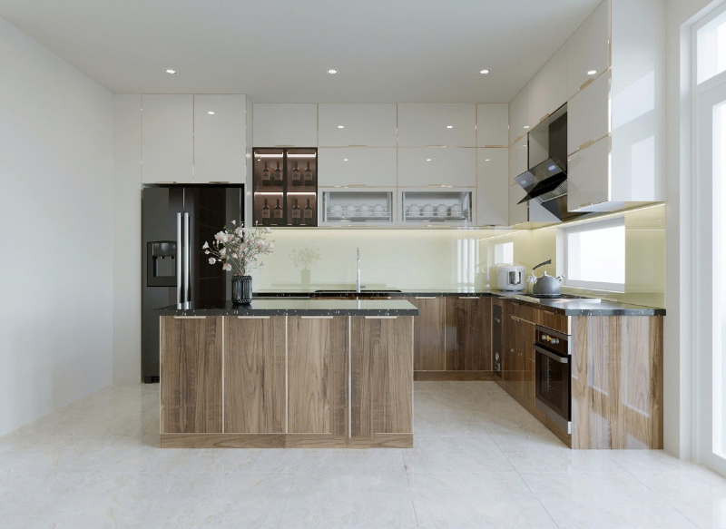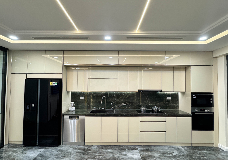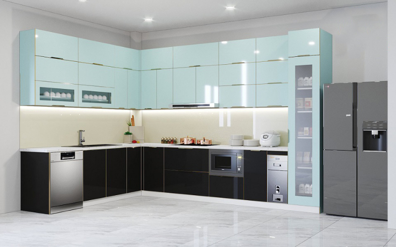 Khung tủ thường được gia công theo dạng modul rời CNC, kết hợp khuôn nhôm để tăng khả năng chịu lực. Phần cánh sử dụng kính cường lực chất lượng cao, có thể tùy chỉnh màu sắc hoặc in họa tiết theo sở thích. Đây được xem là một tổ hợp vật liệu cao cấp, cho phép tủ bếp giữ form ổn định, không phai màu, không trầy xước, đồng thời mang đến diện mạo hiện đại và tinh tế cho toàn bộ không gian bếp.