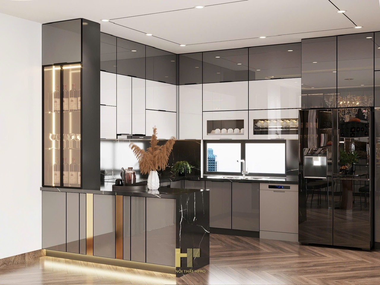 Dưới đây là các mẫu tủ bếp cánh kính đẹp được “biến hóa” bởi những bàn tay tinh tế của đội kiến trúc sư của Nội Thất Hpro: