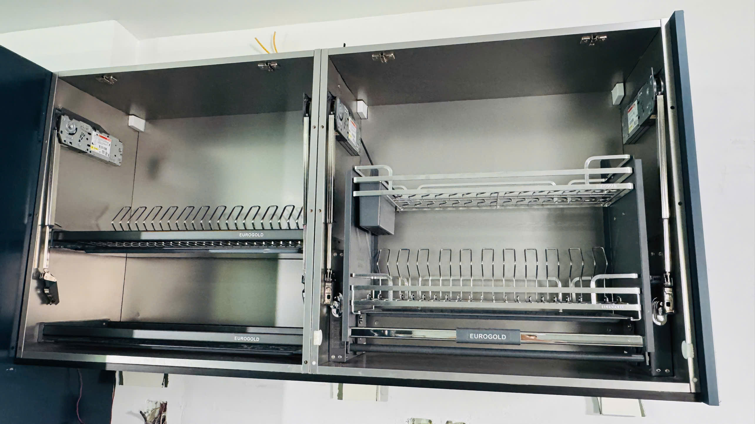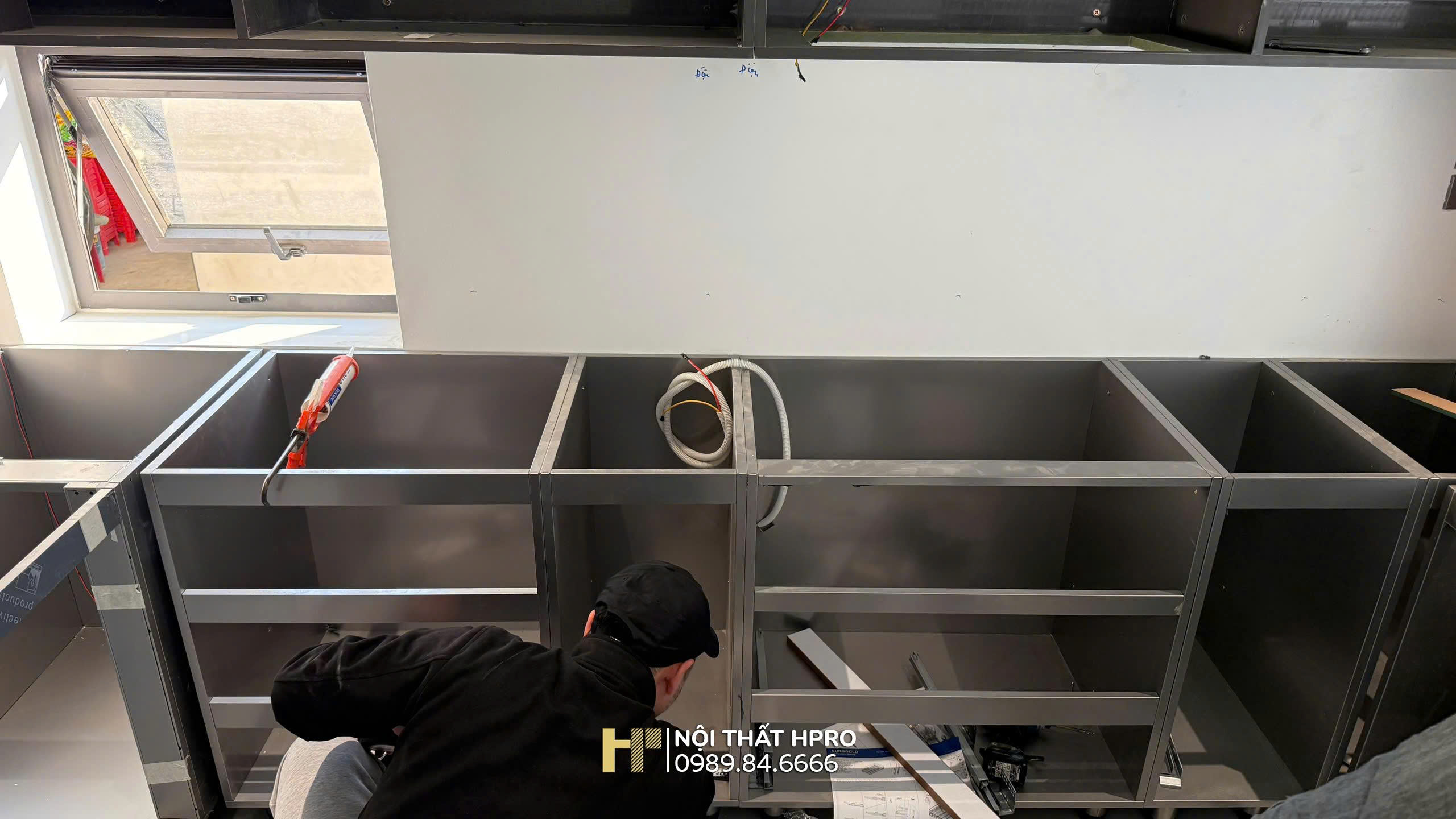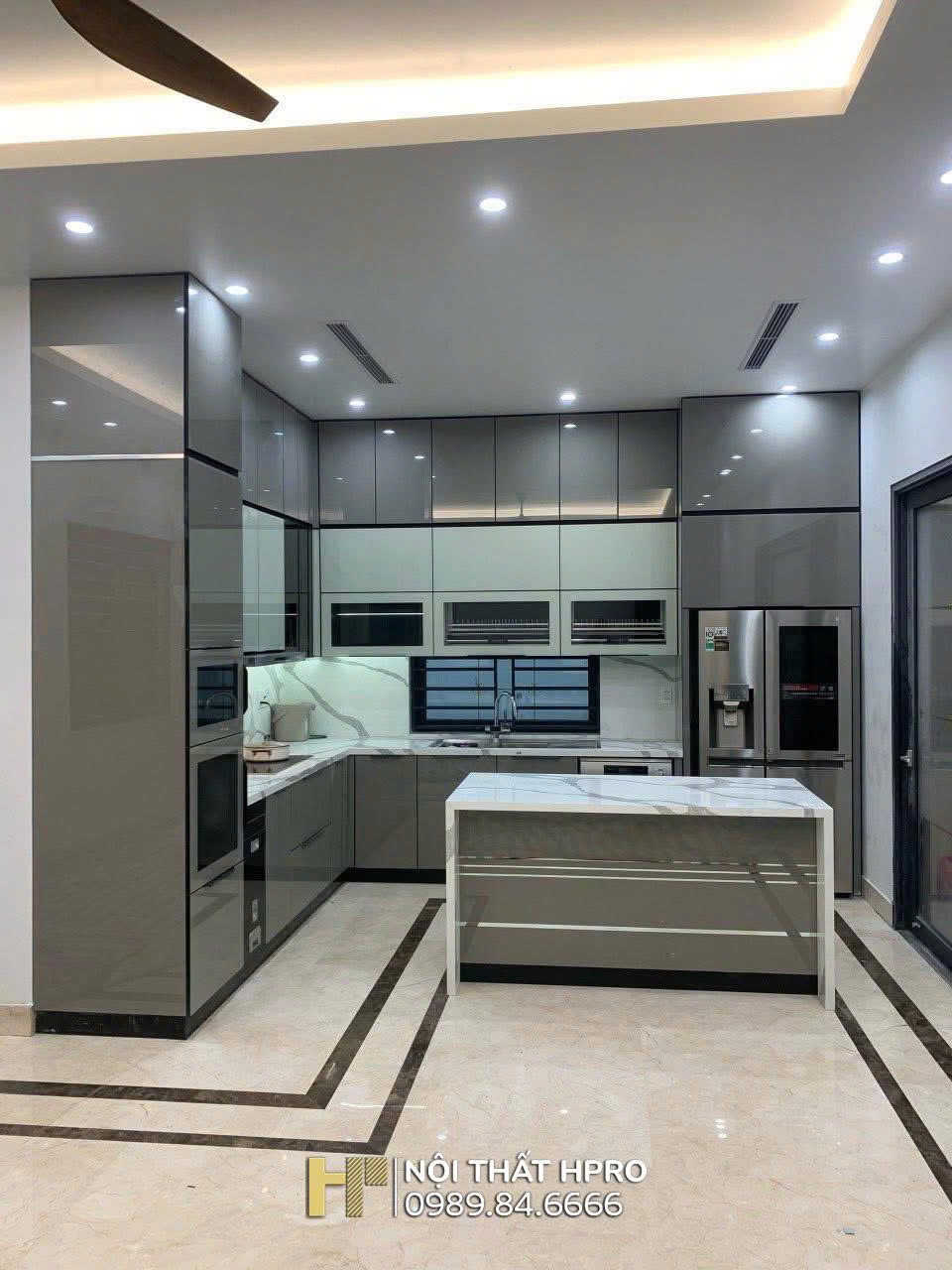 Tủ Bếp Mặt Cánh Kính - Thùng Inox 304 Gập Chấn CNC - Khoang tủ hệ Module rời. Hồi 1 lớp Thùng tủ 100% Inox 304 gập chấn CNC bề mặt kẻ caro chống xước , hồi dày 18mm một lớp kết hợp khung xương tăng cứng chịu lực, không mối hàn. Khoang thùng tủ hệ Module rời tách biệt . Độ dày tấm inox 0.5mm nguyên bản . Hoàn thiện theo thiết kế. Có bàn đảo