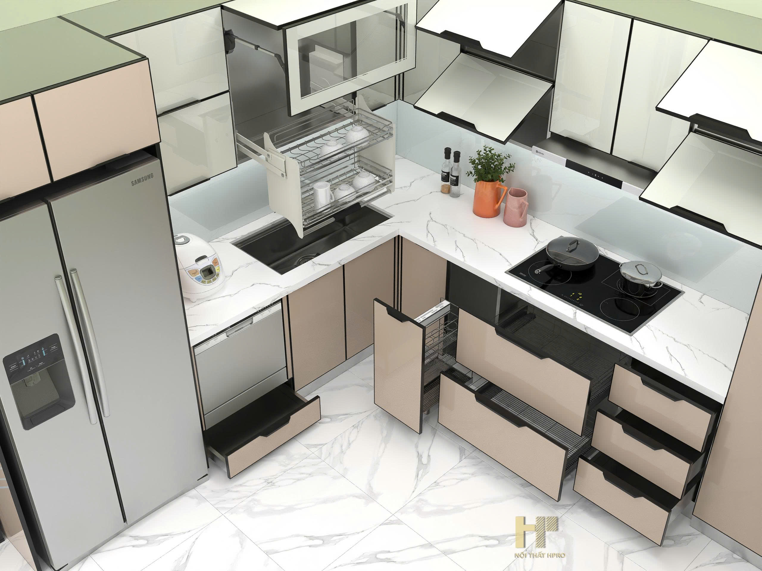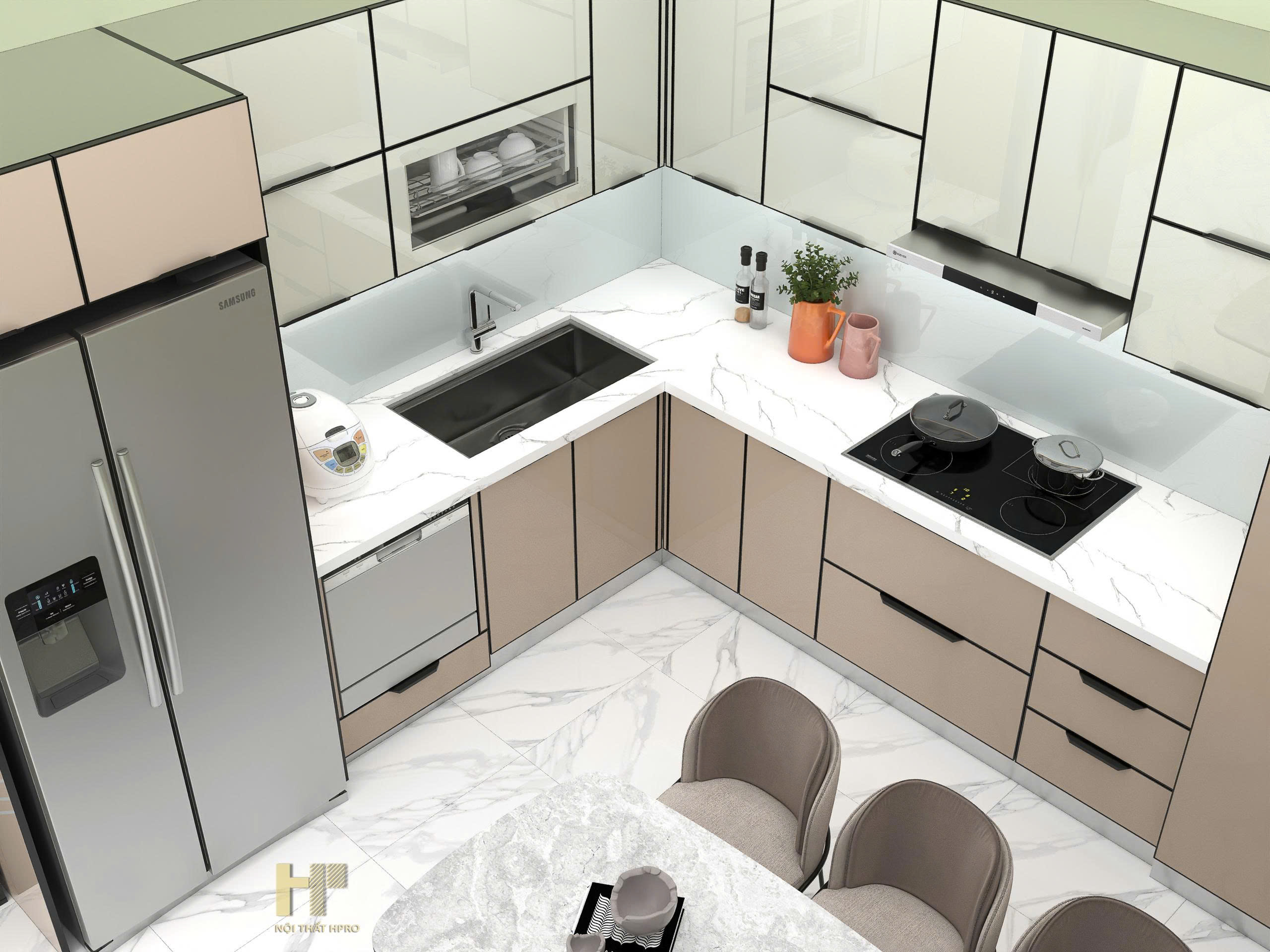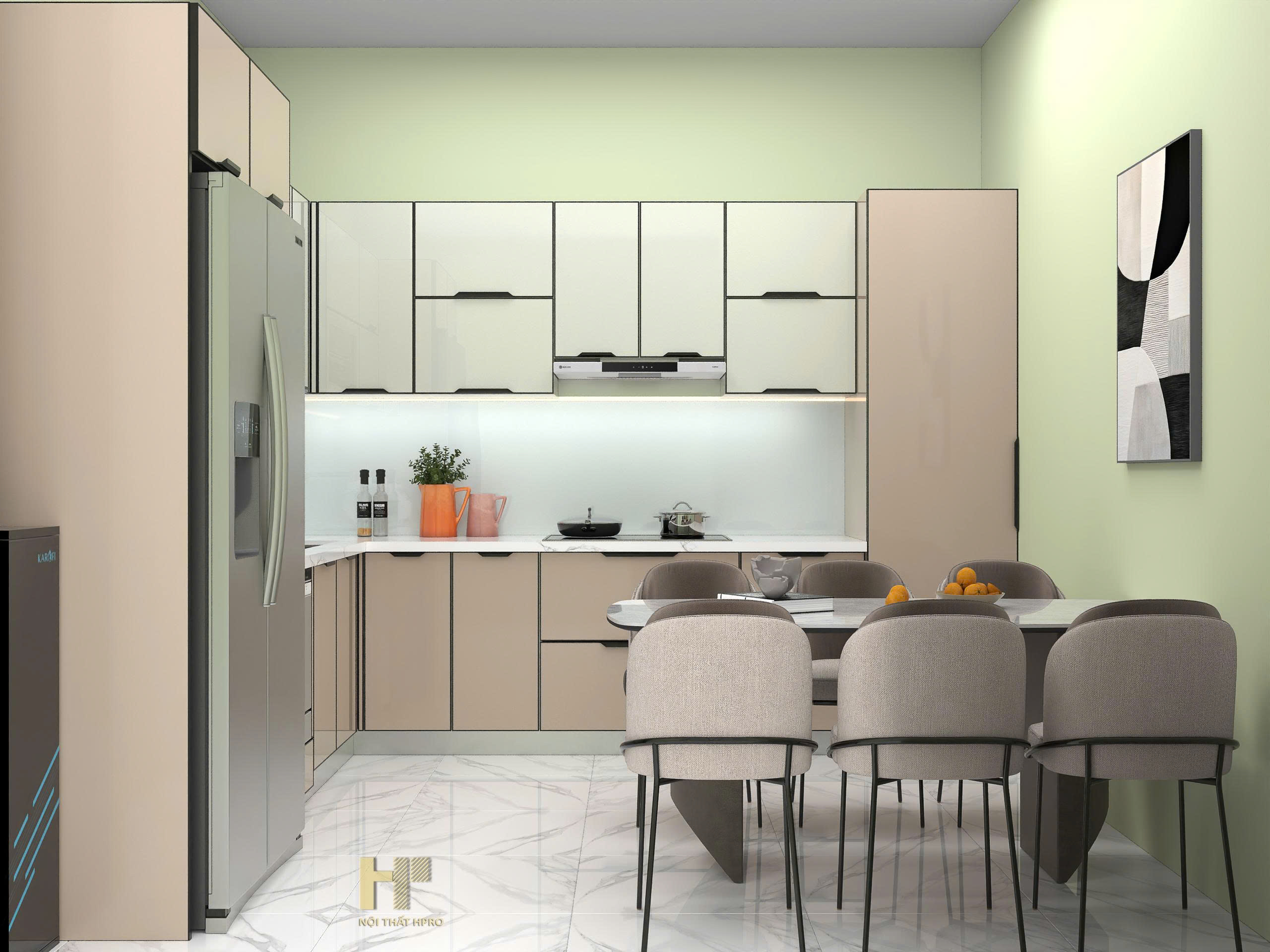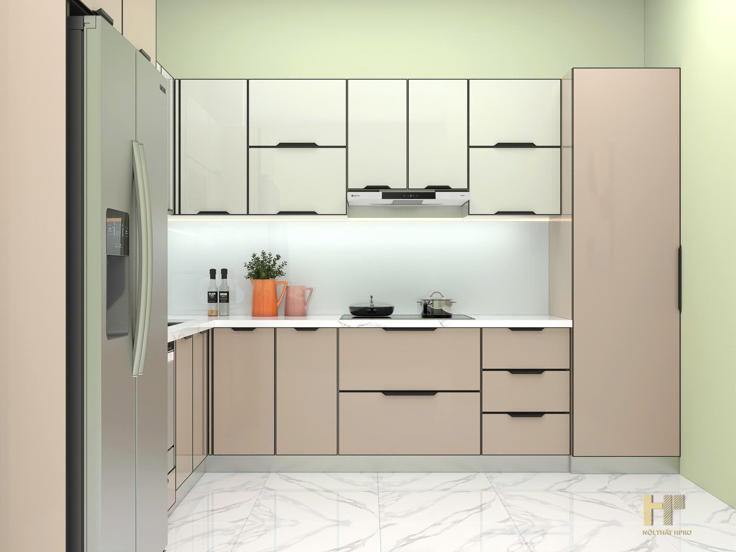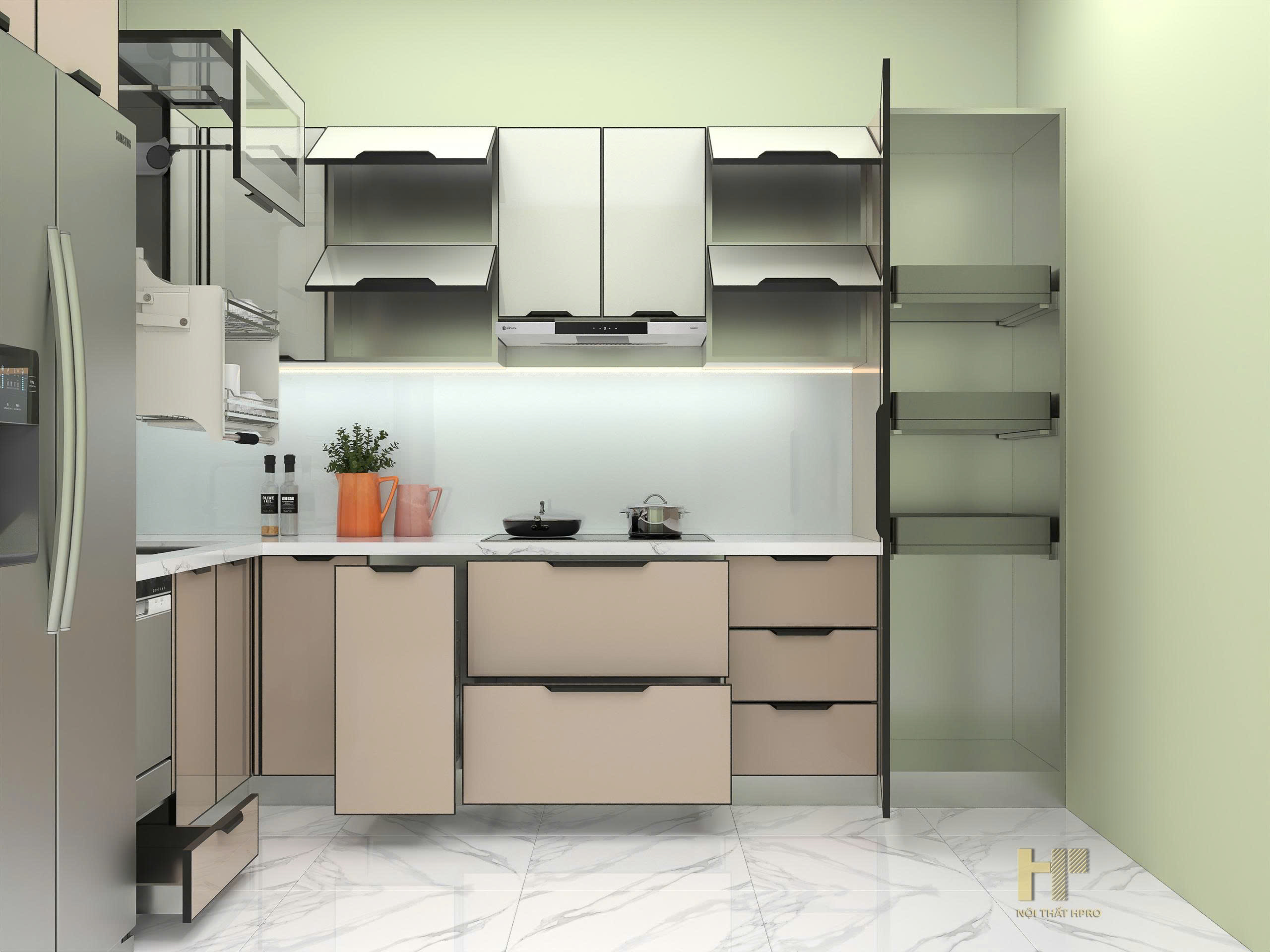 tủ bếp cánh kính nhám mờ chống bám vân tay, thùng inox304 gập chấn module cực kỳ tinh tế và thẩm mỹ, đảm bảo độ bền cận mức tuyệt đối, cho không gian thêm sang trọng