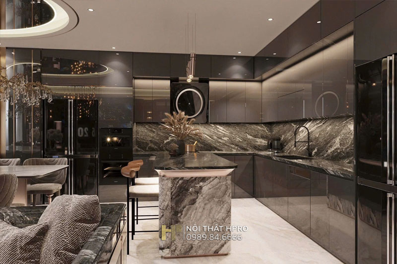 Mặt đá và ốp bếp vân mây nổi bật, sắc nét, tạo nên tổng thể đồng bộ – hiện đại – thời thượng. Đảo bếp lớn được ốp đá toàn khối là trung tâm của thiết kế, vừa có tính thẩm mỹ cao, vừa phục vụ tối ưu cho việc chế biến và bày biện đồ ăn.