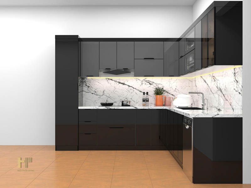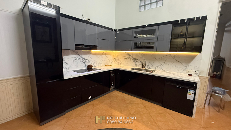 Hpro thiết kế và thi công hoàn thiện mẫu tủ bếp TBCK12 cho căn hộ nhà vườn tại Hà Nội. Kiểu dáng bếp chữ L với thiết kế phẳng phong cách hiện đại.