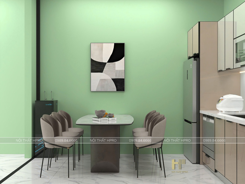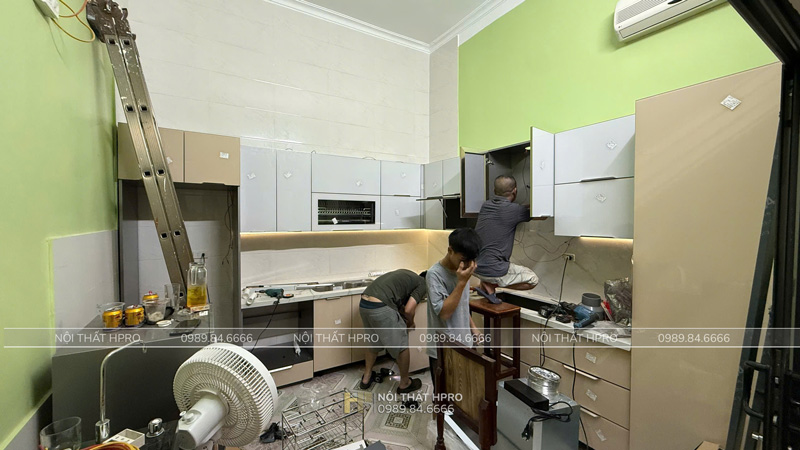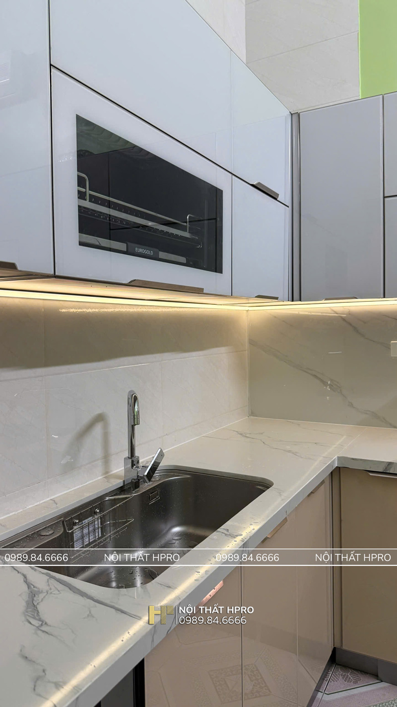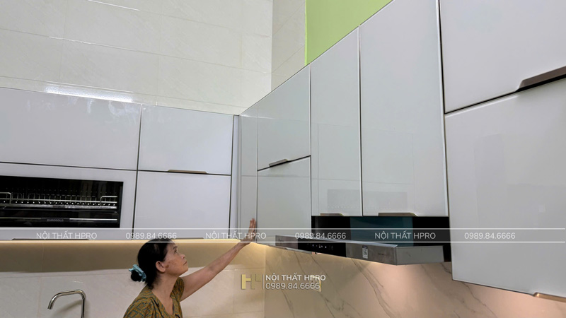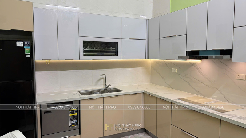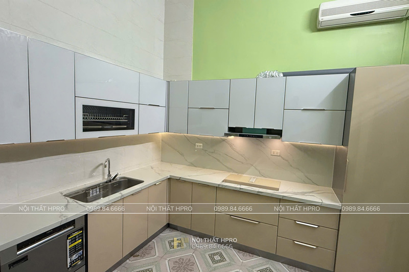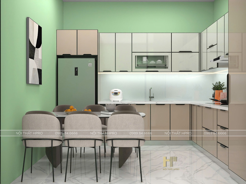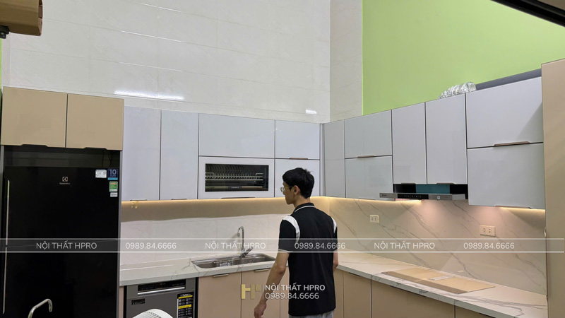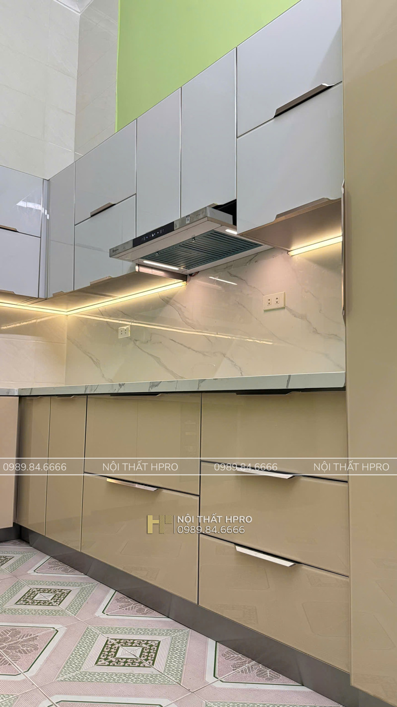 Lại thêm một công trình thực tế Hpro thi công tại Thành phố Vinh - Nghệ An - Chiếc tủ bếp cánh kính tone trà sữa với tủ dưới màu be và tủ trên màu trắng kem, nổi bật trên nền tường màu xanh bạc hà, tạo nên concep rất tự nhiên và dịu mắt.