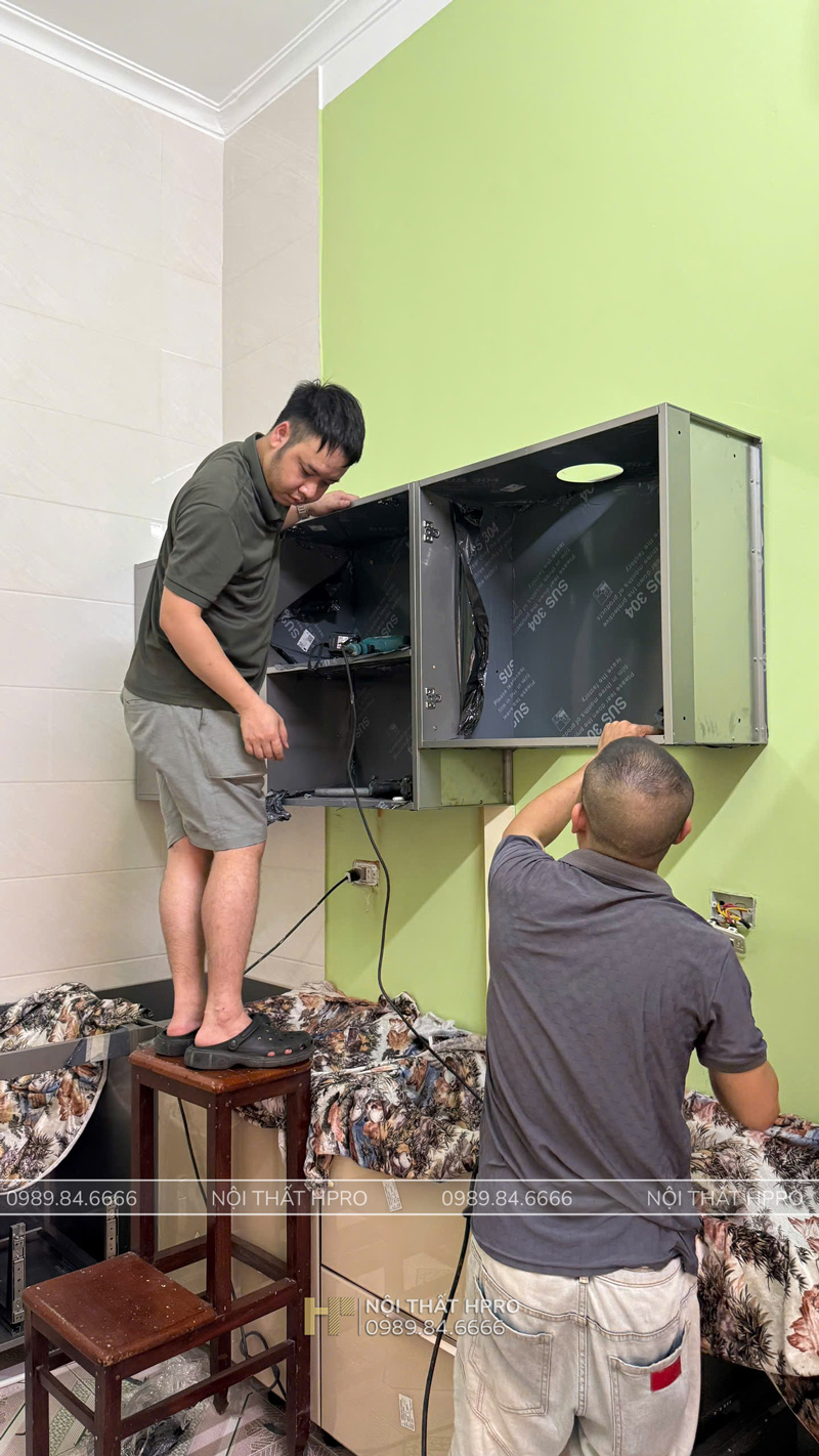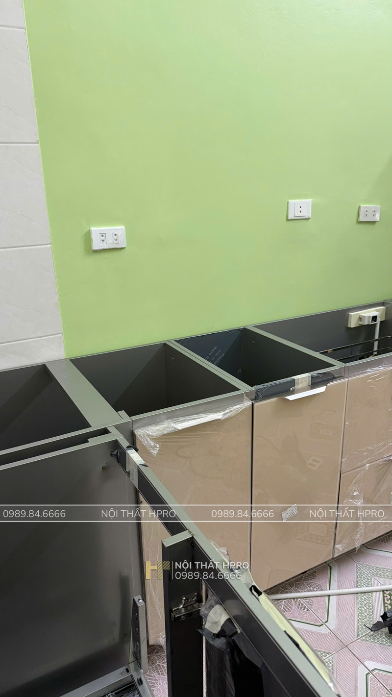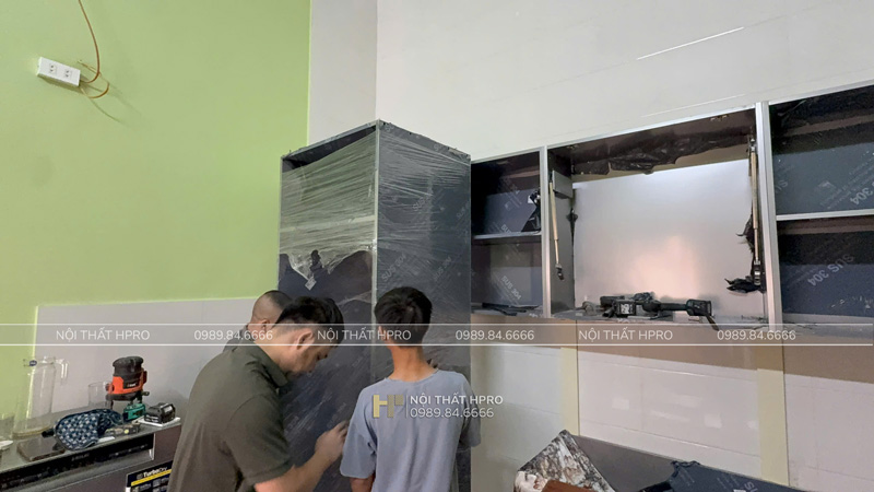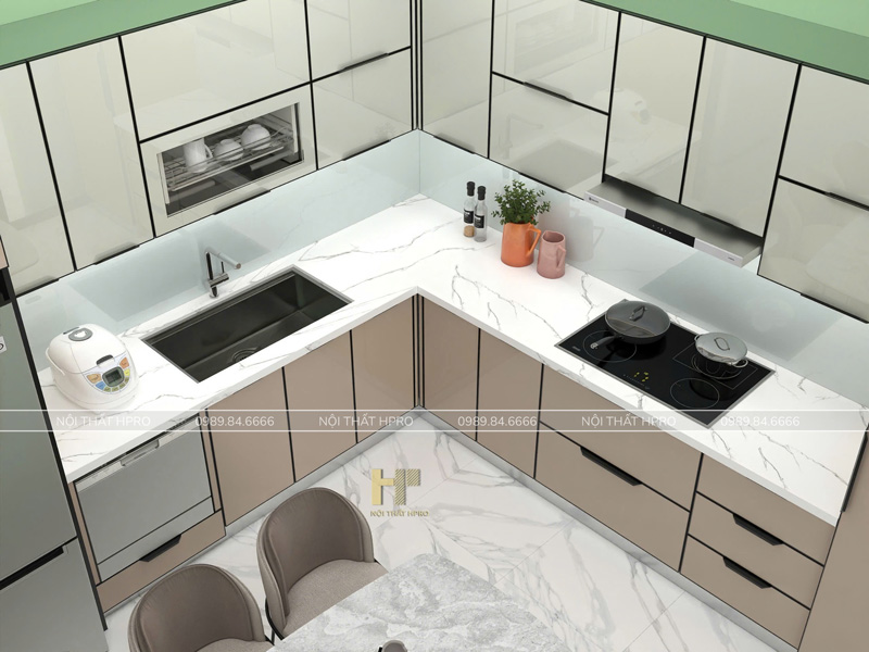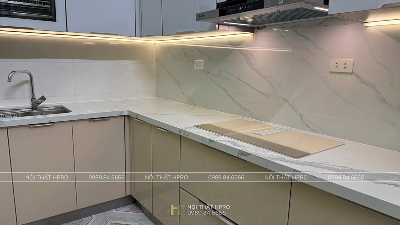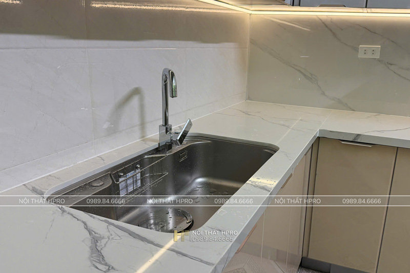 Hpro hoàn thiện và lắp đặt công trình tủ bếp cánh kính TBCK13 thùng tủ Inox304 với thiết kế hiện đại, bề mặt phẳng sần caro tinh tế, chống bám bẩn, dễ lau chùi.
