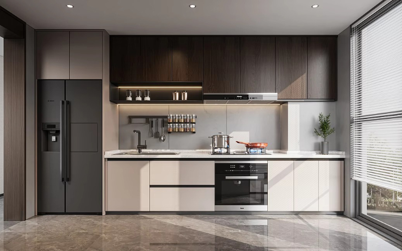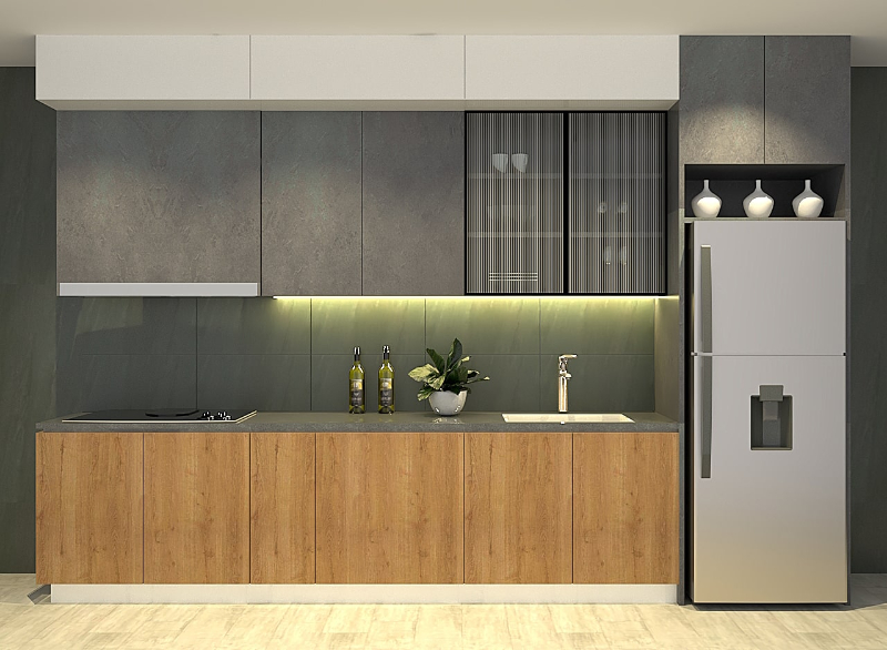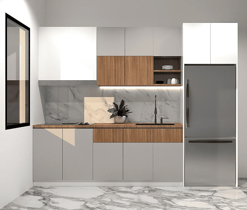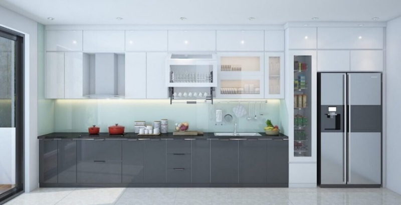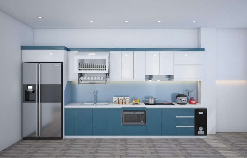 Với cấu trúc một dãy tủ thẳng, không chia cắt hay gấp khúc, kiểu tủ này giúp không gian bếp trở nên gọn gàng, thông thoáng và dễ dàng bố trí trong mọi loại hình nhà ở, đặc biệt là căn hộ nhỏ và nhà phố.