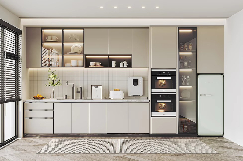 Bố cục tủ được sắp xếp theo một đường thẳng duy nhất, giúp căn bếp gọn gàng, thoáng đãng và tiết kiệm diện tích tối đa. Tông màu chủ đạo là kem nhạt phối xám be, kết hợp ánh sáng vàng từ hệ đèn âm tủ, tạo cảm giác ấm cúng nhưng vẫn rất sang trọng.
