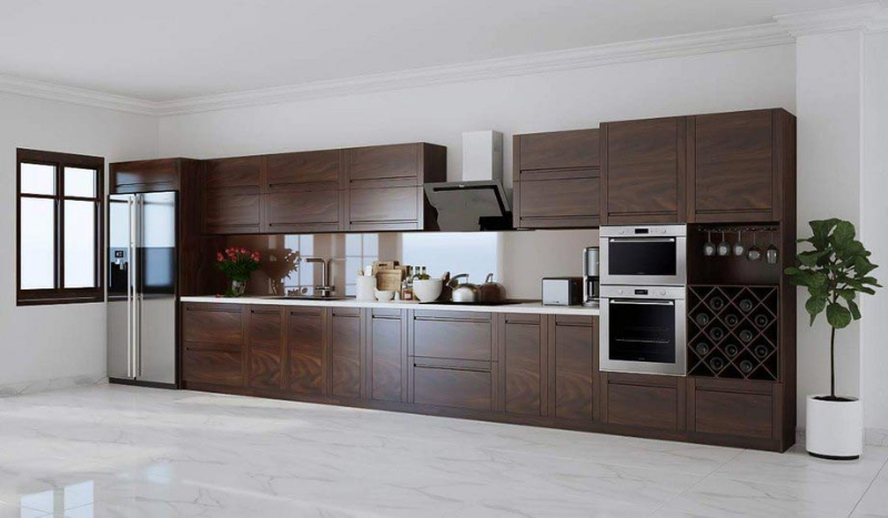 Toàn bộ hệ tủ được bố trí trên một đường thẳng dài, mang đến cảm giác thoáng đãng và đồng bộ. Gam màu nâu cánh gián đậm cùng vân gỗ tự nhiên nổi bật giúp căn bếp toát lên vẻ ấm cúng, quyền quý và bền vững theo thời gian.
