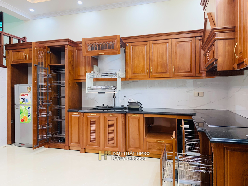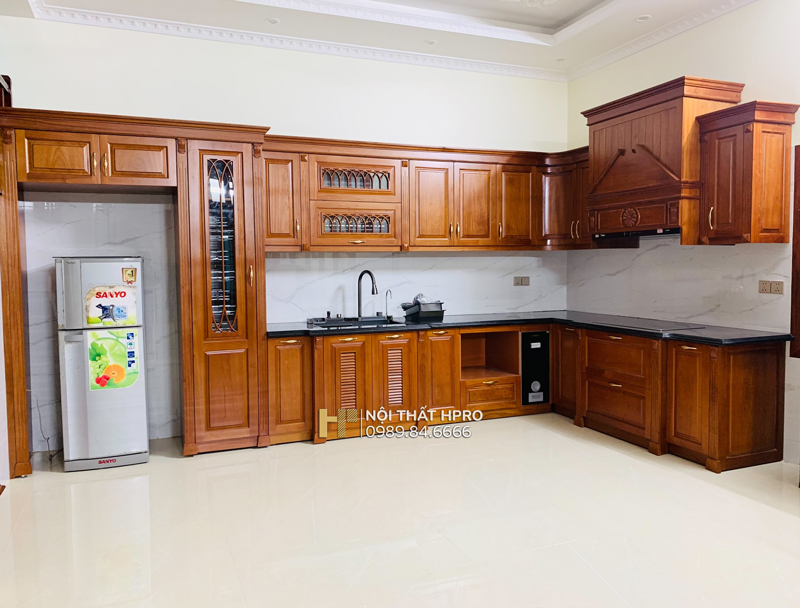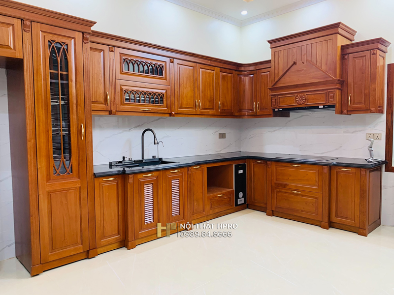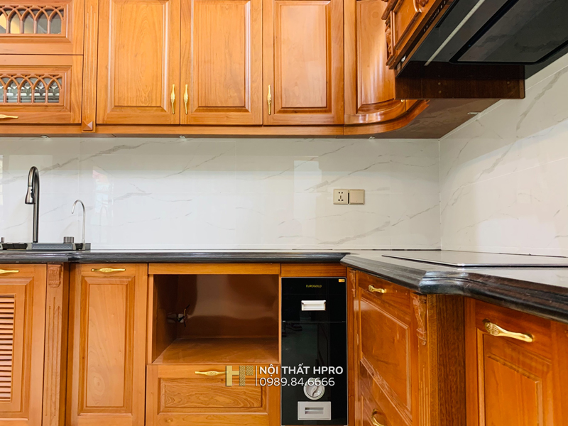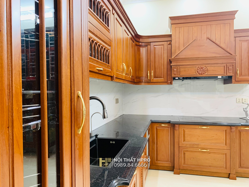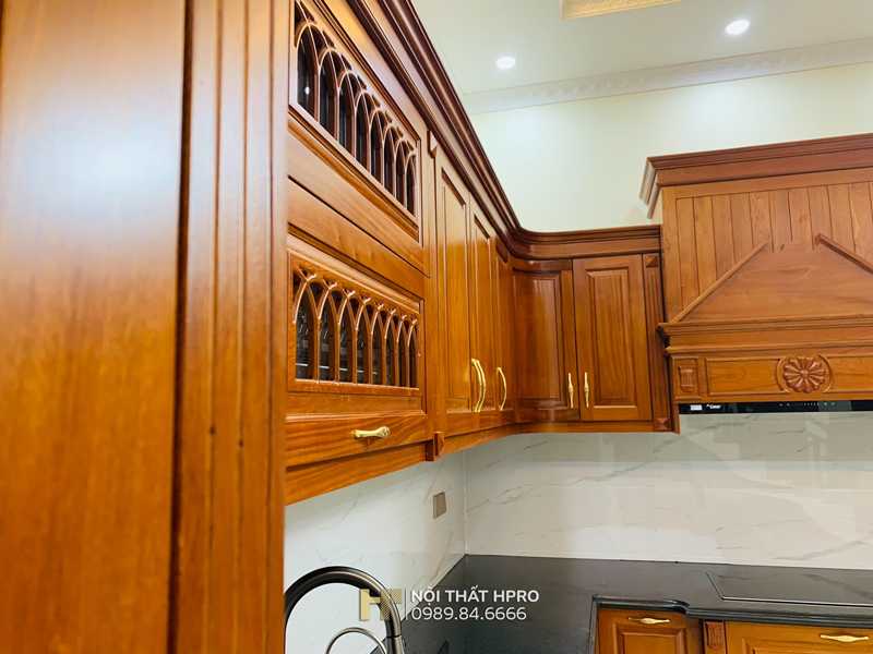 Từng hạng mục tủ bếp gỗ gõ đỏ Pachy TBGD04 được Hpro thi công chỉn chu theo đúng bản vẽ thiết kế, từ kết cấu khung thùng, hệ cánh tủ, phào chỉ, hoa văn trang trí, lắp đặt thực tế tại căn biệt thự vườn Hà Nội.