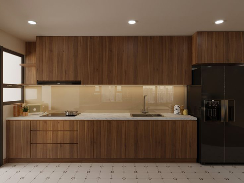 Mẫu 4: Thiết kế tủ bếp chữ I gỗ óc chó kịch trần