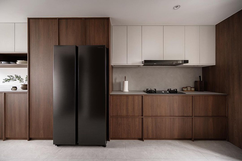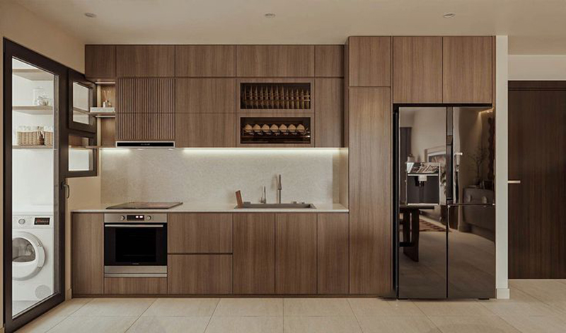 Layout chữ I vốn đã cực kỳ tối giản, gỗ óc chó bổ sung thêm về chiều sâu thẩm mỹ, từ đó giúp bếp không bị “mỏng” hay đơn điệu dù chỉ thiết kế bố trí theo một dải tủ.