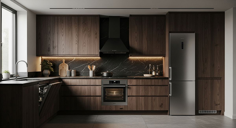 Gỗ óc chó thiết kế bếp chữ I thường rất “ăn” với các nhóm vật liệu đi kèm như sau: