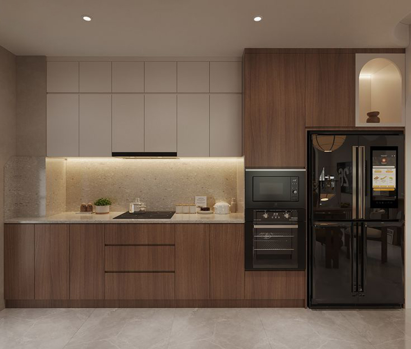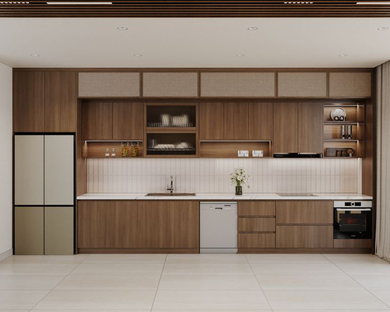 Mẫu 8: Tủ bếp chữ I gỗ óc chó thiết kế Japandi