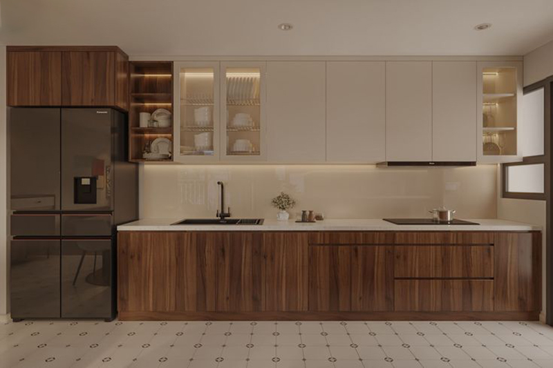 Mẫu 3: Tủ bếp chữ I gỗ óc chó phối kính trong