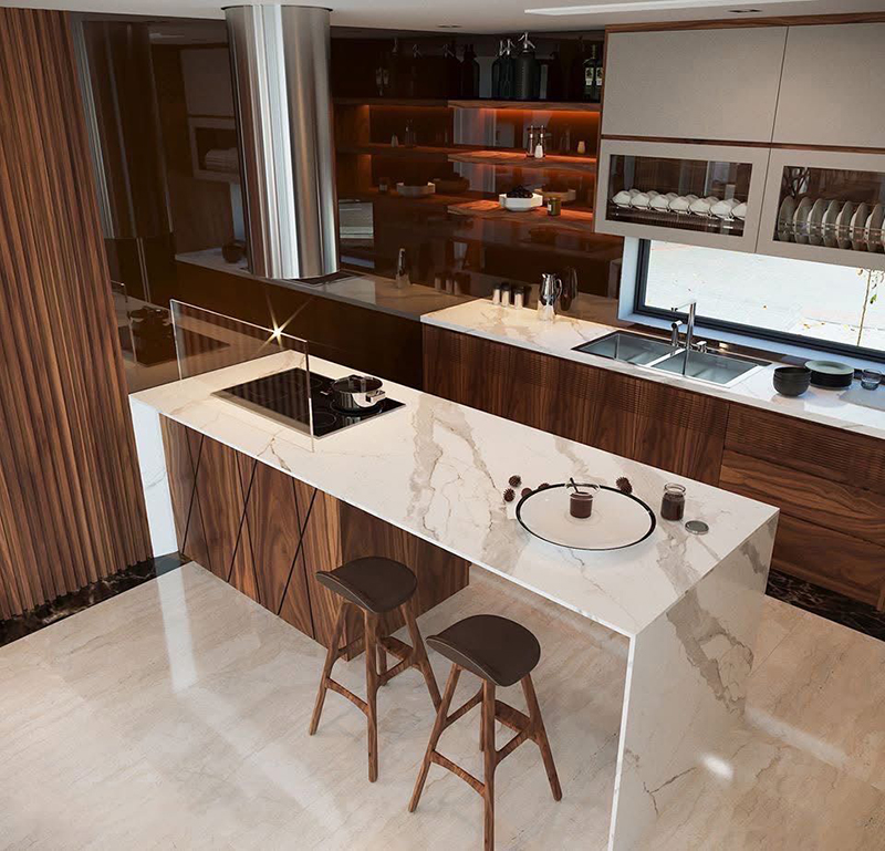 Mẫu 12: Thiết kế tủ bếp gỗ óc chó kết hợp mặt đá trắng vân