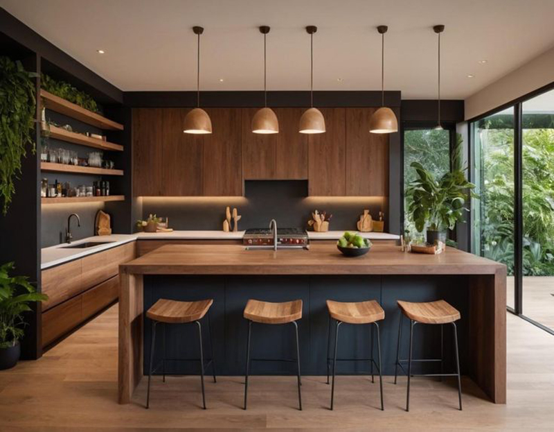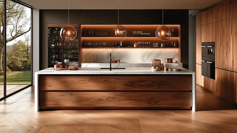 So với thiết kế chữ U, thì chữ L sẽ giúp giảm số lượng các mảng tủ lớn, nhờ đó mà gỗ óc chó vốn mang sắc trầm nhưng vẫn giữ được vẻ sang mà lại không làm cho không gian bị tối hay nặng.
