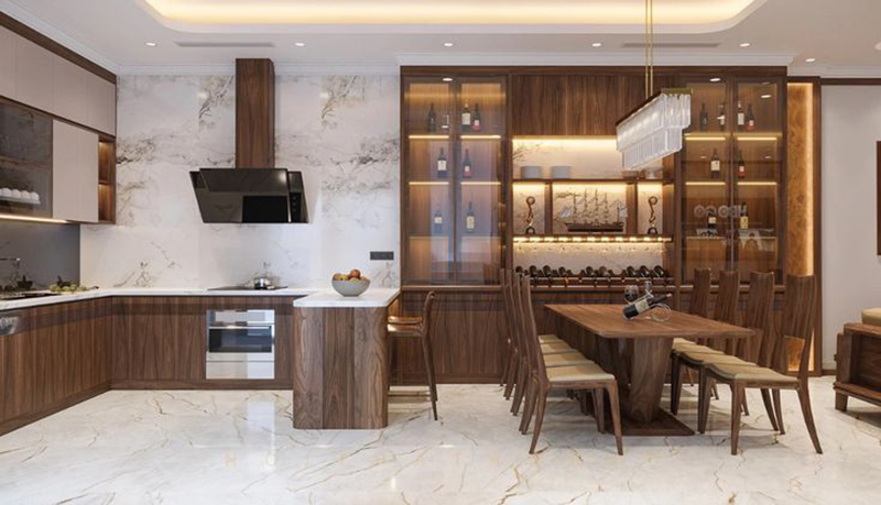 Mẫu 14: Tủ bếp chữ L tích hợp với tủ rượu/pantry