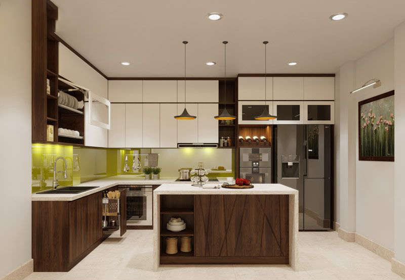 Mẫu 5: Chữ L thiết kế thiết bị âm tủ cực gọn gàng, hiện đại
