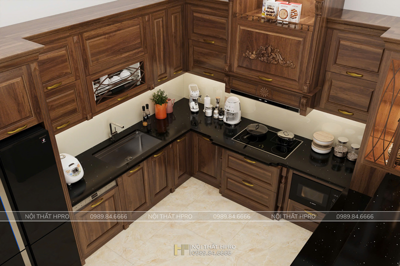 Toàn bộ tủ bếp được làm từ gỗ óc chó tự nhiên không chỉ đẹp mà còn bền, ổn định, ít cong vênh, càng dùng càng lên màu đẹp theo thời gian. Kiểu dáng chữ L tích hợp đầy đủ các thiết bị bếp, phụ kiện như bếp từ, máy rửa bát, chậu rửa một hố, lò nướng, thùng gạo thông minh,...